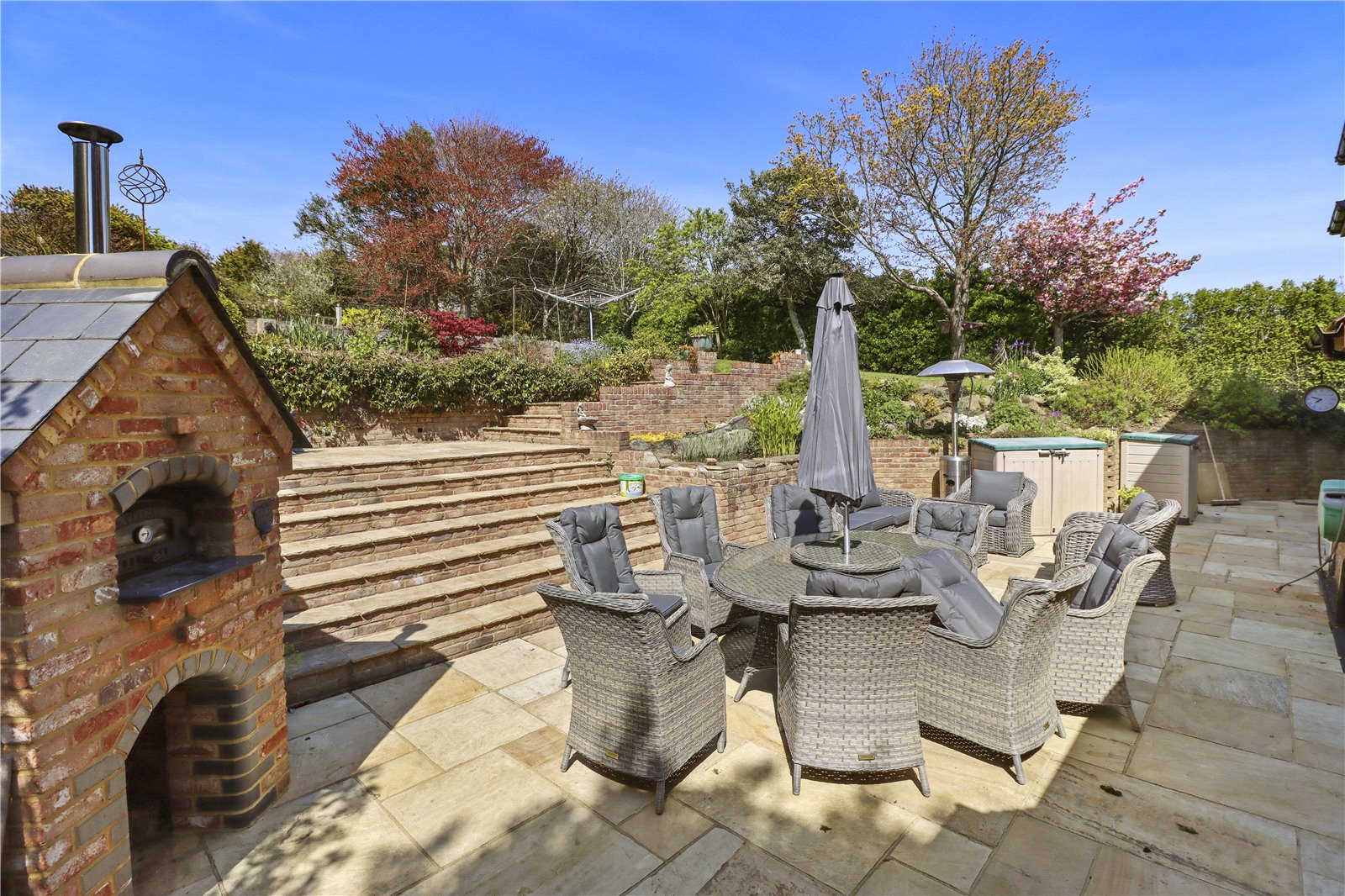 REAR GARDENS AND GROUNDS: Arranged on two main levels and with the lower-level benefitting from extensive paved sun terraces with a bespoke built alfresco dining area that incorporates a pizza oven and outside cooking area. From the sun terraces and alfresco dining area, are steps leading up passed an ornamental fishpond to extensive sized lawned areas with mature trees and boundary fences either side, as well as a variety of shrubbery and flowers.