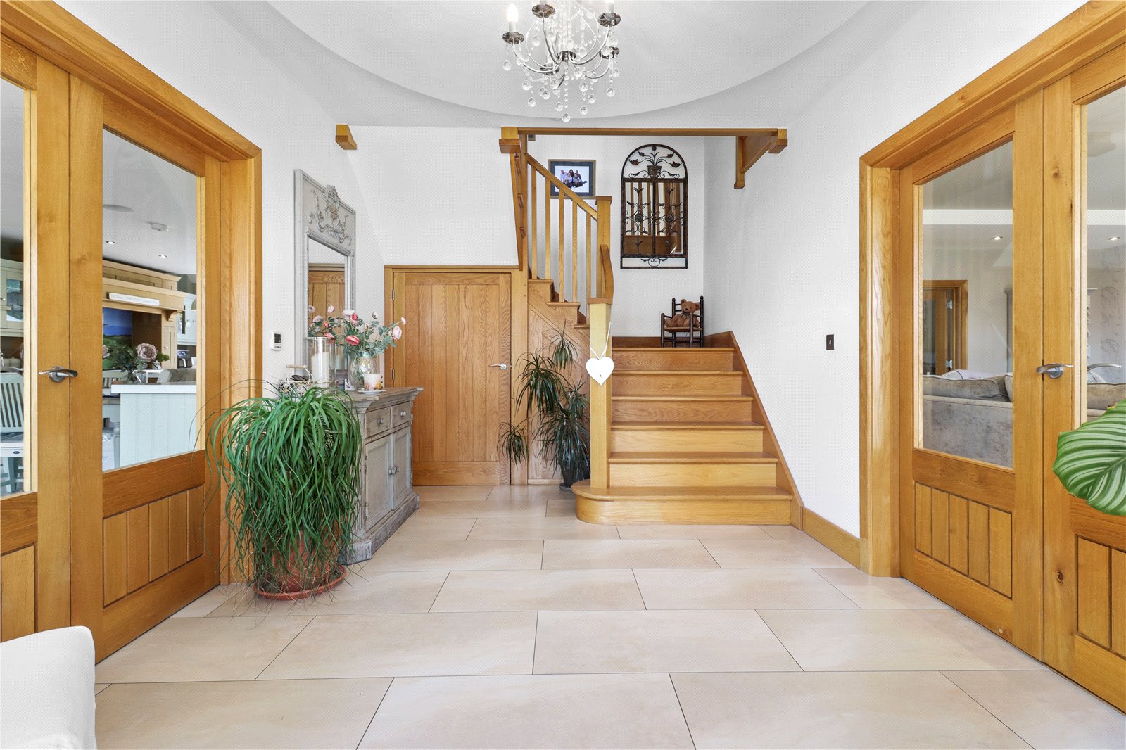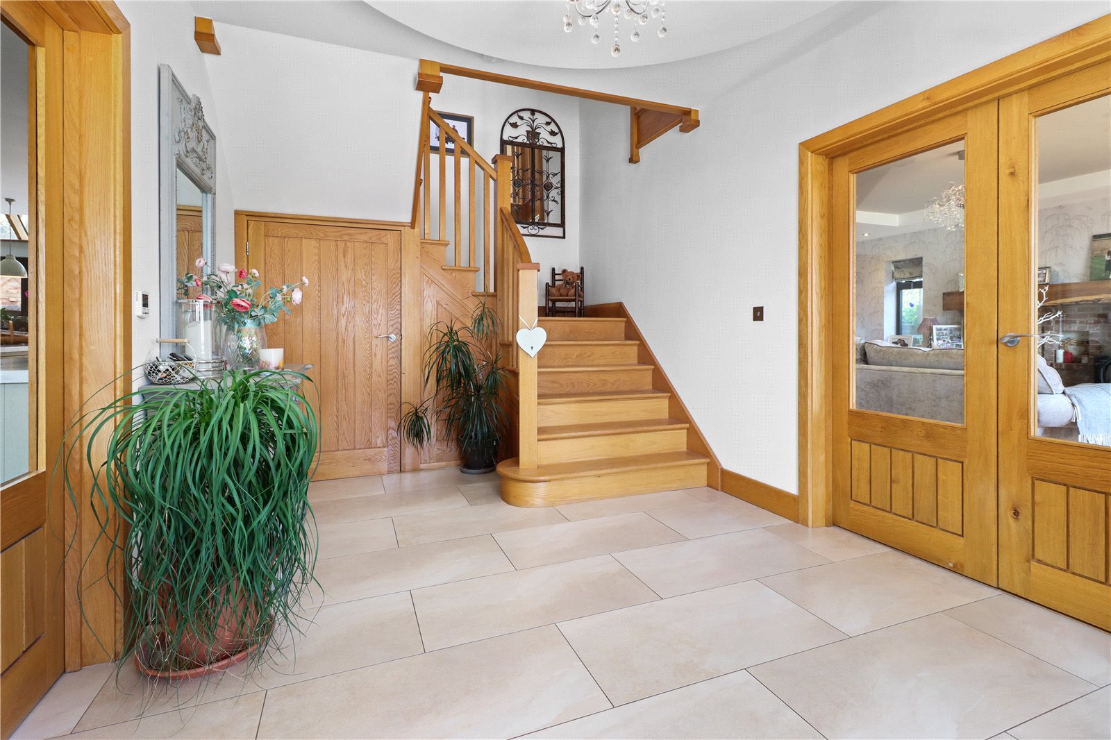 MAIN RECEPTION HALL: Comprising of elegant large sized tiled floors with underfloor heating, concealed ceiling lighting, as well as a feature central chandelier ceiling light, cottage style bespoke oak door to the far end of the reception hall leading to extensive sized under stairs storage area, further large twin bespoke oak and glazed doors leading off from the main reception hall to a sitting room and also to a lounge, as well as a fabulous bespoke solid oak staircase leading off from the main reception hall to the first floor accommodation.