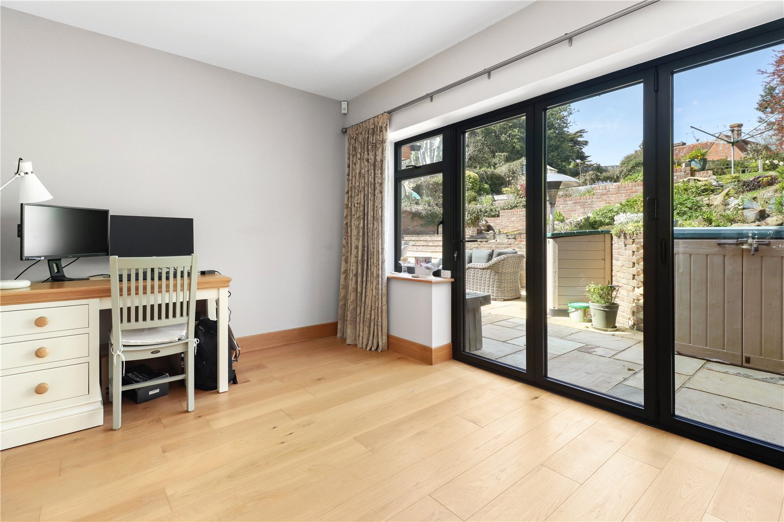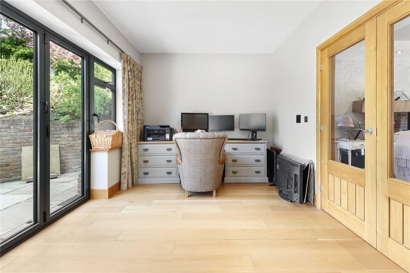 STUDY ROOM ADJOINING SITTING ROOM: Comprising of oak floors with underfloor heating, double glazed windows with aspect over the rear gardens and sun terraces, further full height large double glazed bi folding doors opening out to the rear sun terrace.