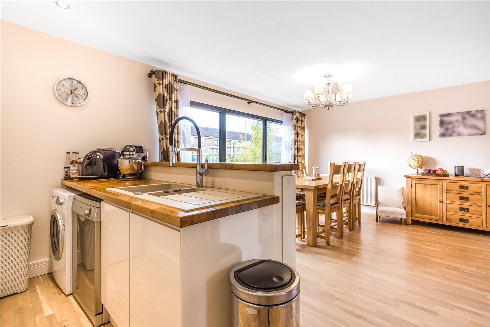KITCHEN / BREAKFAST ROOM: A large open plan extensive area with attractive light oak wooden floors and a comprehensive range of high gloss fitted cupboard and base units with oak worktops in addition to a stylish breakfast bar and preparation area to one end. The breakfast bar comprises of high gloss sides and units with oak worktops and preparation areas, a fitted 1 ½ sink unit with chrome mixer tap, space for dishwasher, space for washing machine, fitted Bosch oven and grill, ceramic hob, further storage cupboards.
