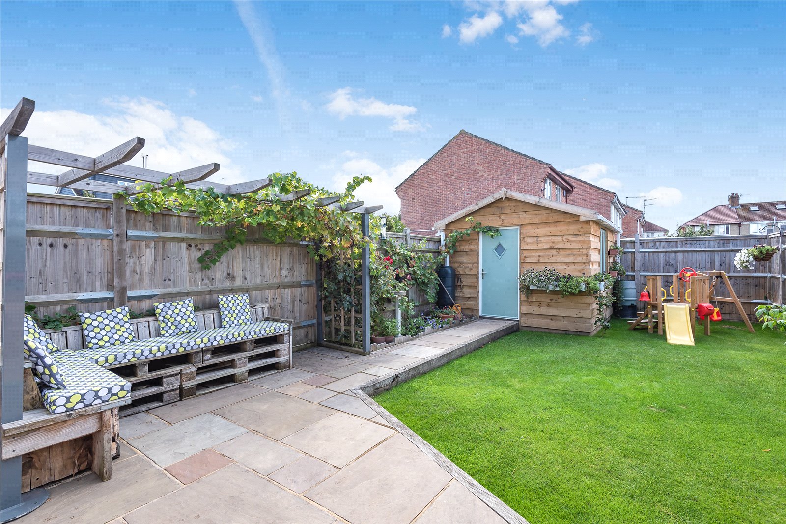 REAR GARDEN: Comprising of level lawn and Indian paved stone terrace, with path leading to large bespoke built shed with power connected. This shed may have possibilities subject to regs and planning to use as a home office. Gate leading to side access.