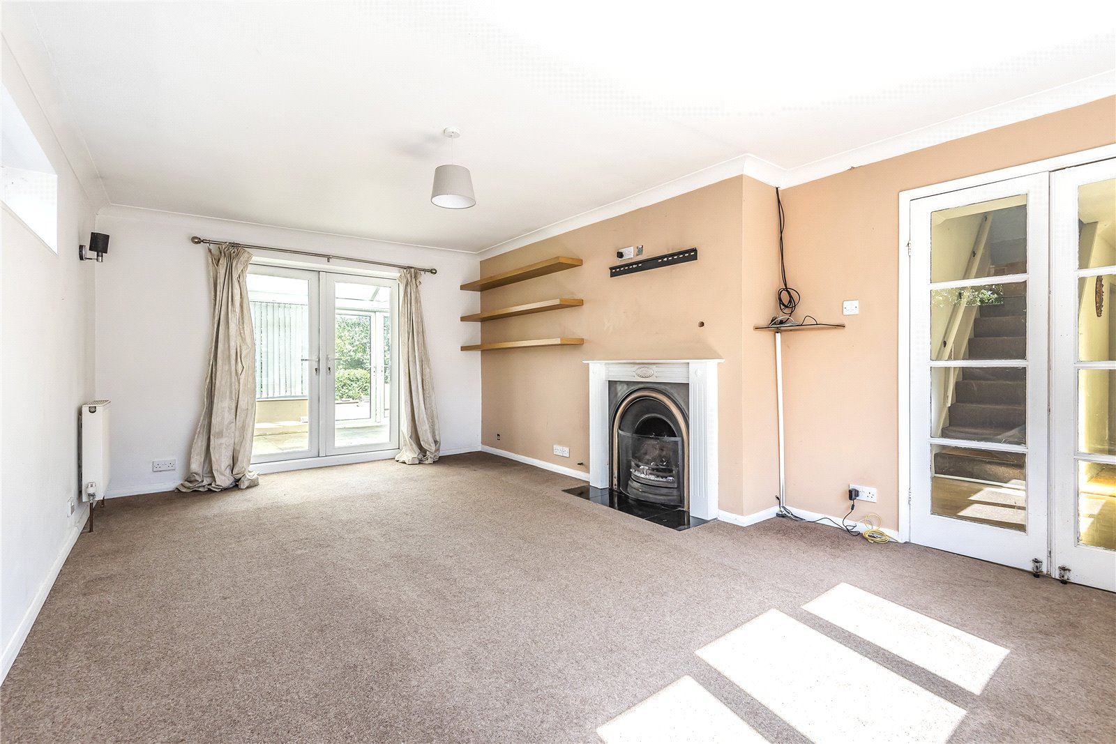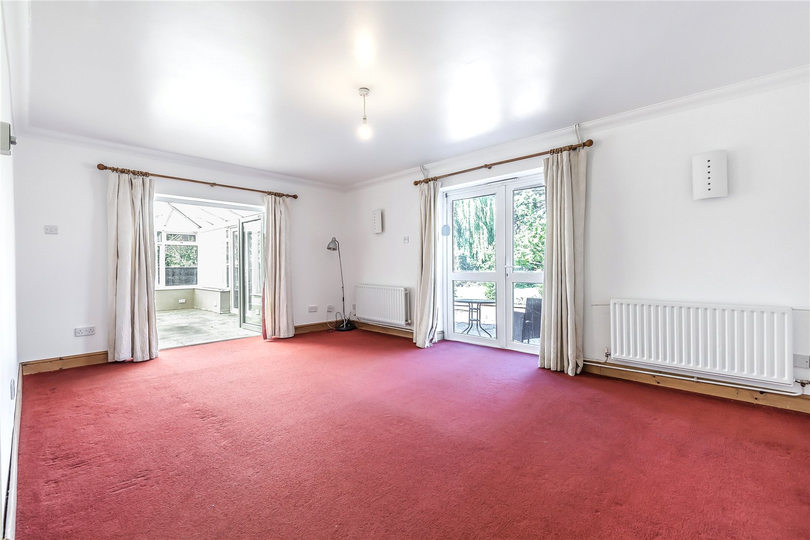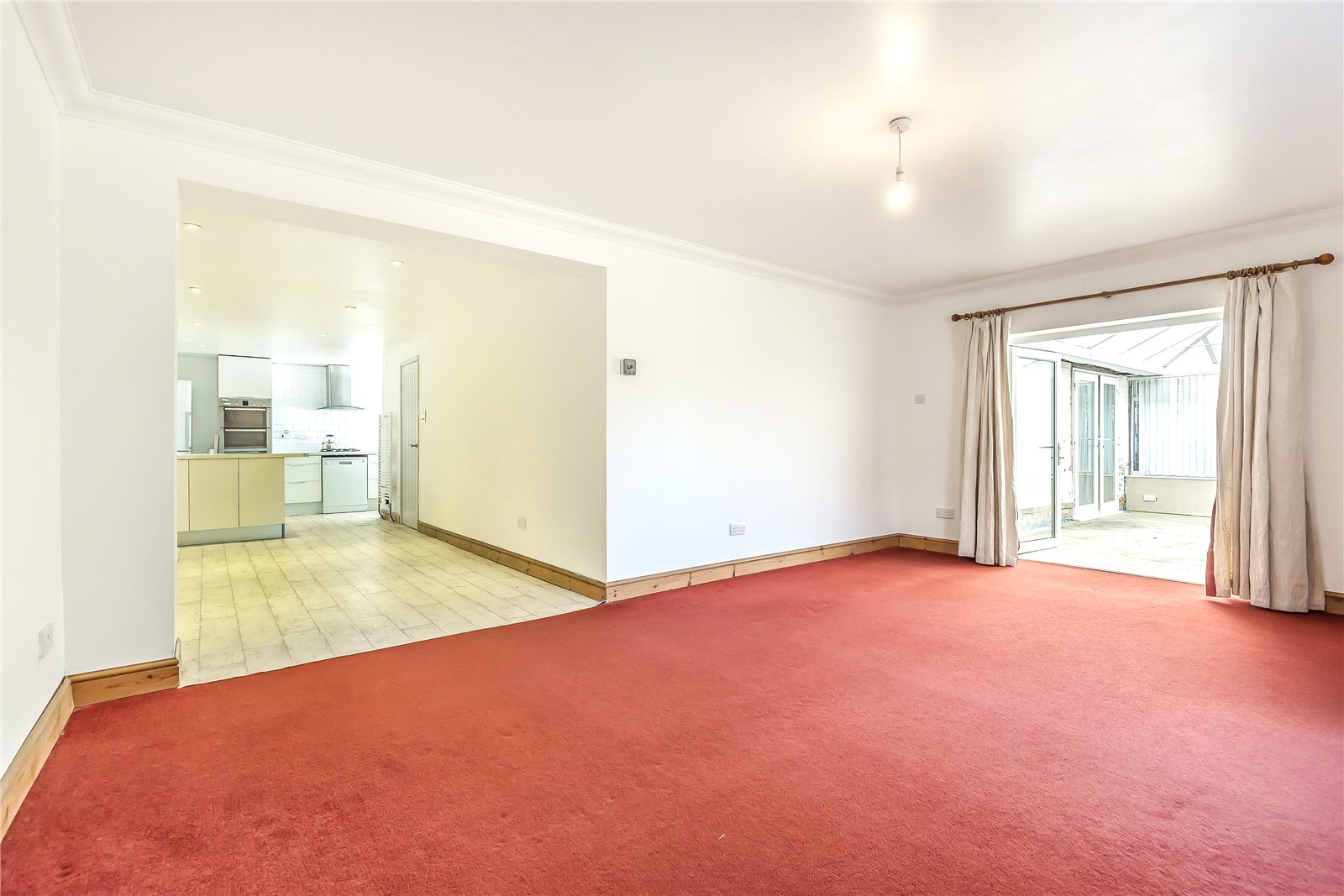 SITTING ROOM (OPEN PLAN): A double aspect room with coved ceiling, two radiators, ceiling light, double glazed French doors leading to rear garden and further French doors leading conservatory.