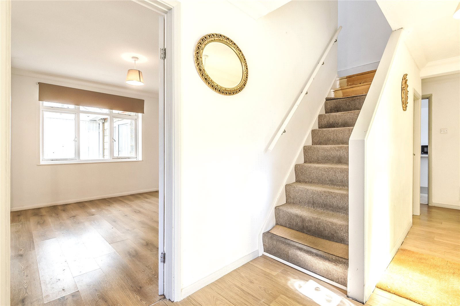 ENTRANCE HALL: Approached by panelled wooden front door, with coved ceiling, radiator, ceiling light, engineered light oak wood flooring, walk in coats cupboard, door to cloakroom.