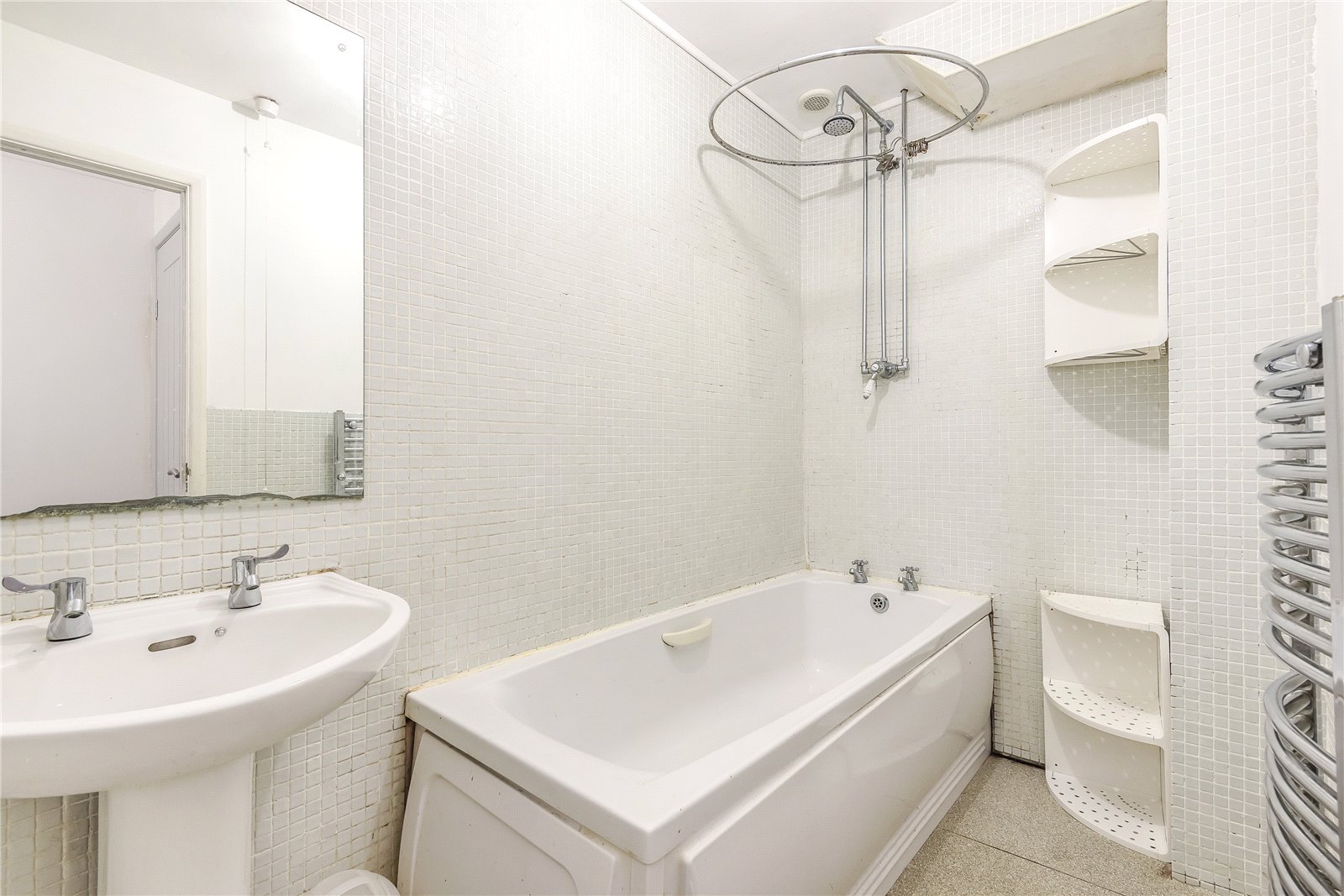 DOWNSTAIRS BATHROOM / SHOWER ROOM: Comprising of a panelled bath with chrome shower system over, tiled walls, pedestal wash basin with chrome taps, chrome towel rail.
