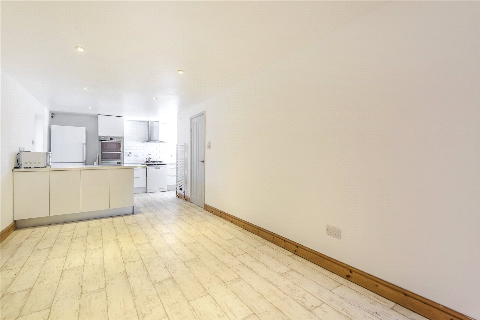 DINING ROOM (OPEN PLAN): With light limewash wood board effect lino flooring, down lights fitted cupboard housing boiler, beyond the open plan dining room is the open plan sitting room.