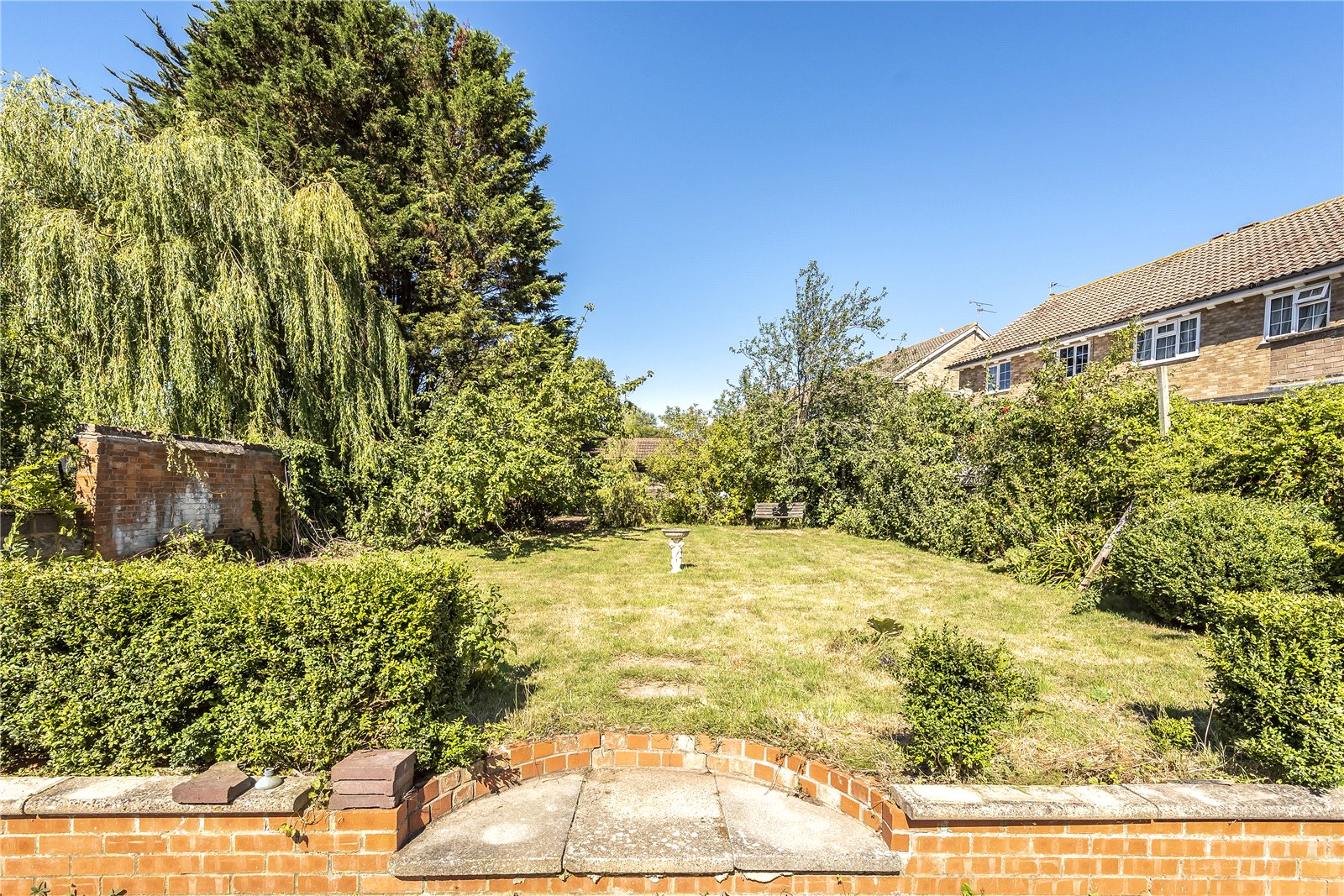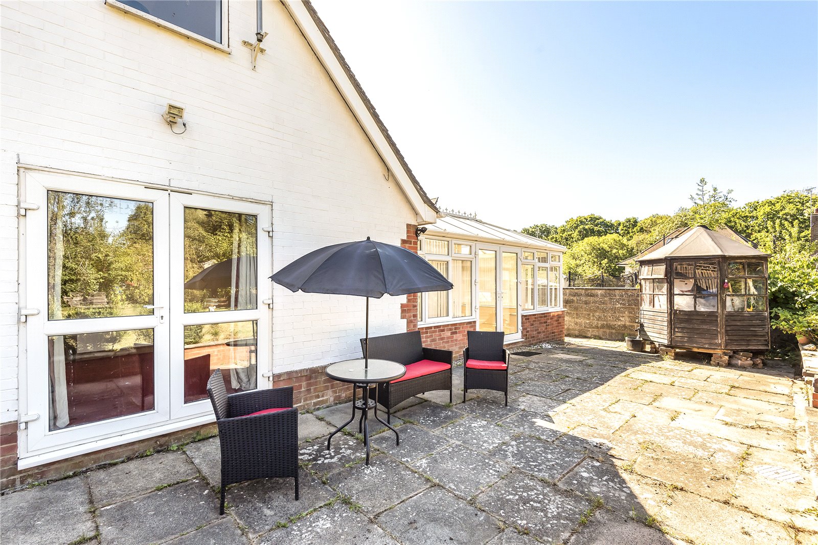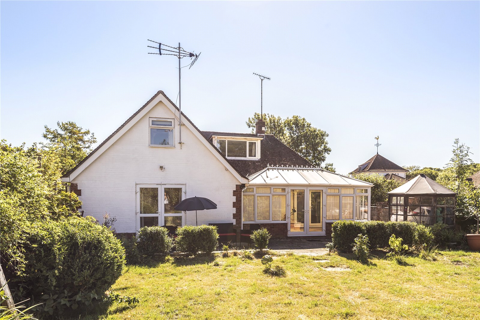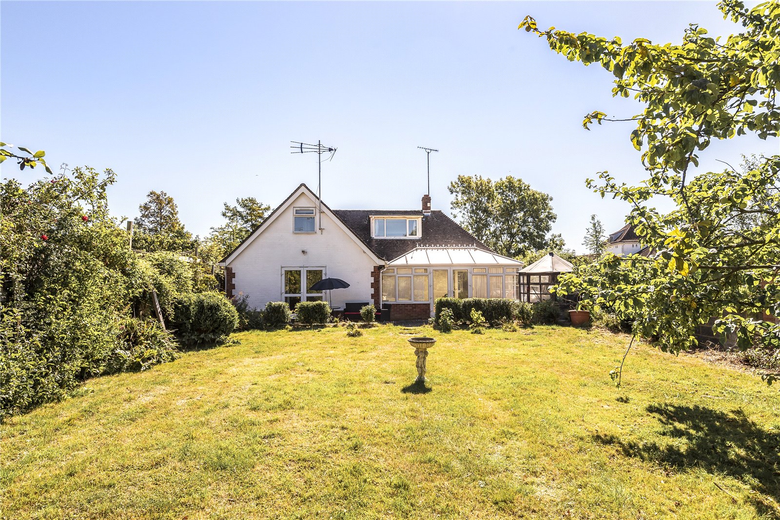 REAR GARDEN: Approached from the side access outside or from the double glazed French Doors from either the conservatory or sitting room. This charming mature garden enjoys a sunny aspect and is arrange with a paved sun terrace by the chalet area with level lawn areas beyond. Either side of the lawn areas are shrubs and a variety of fruit trees. There is a further extended area of garden beyond that presently has old storage sheds and composting areas.