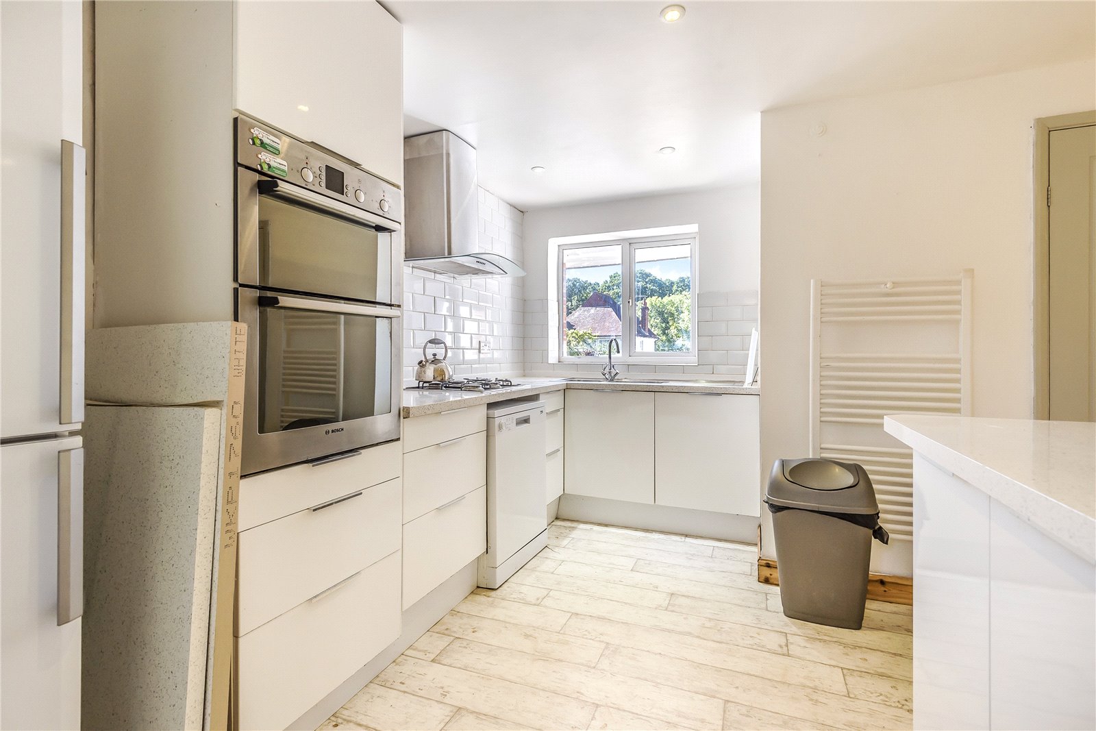 KITCHEN / BREAKFAST ROOM: Comprising of modern cupboard and base units with white granite effect work tops over, with further matching covered preparation area with breakfast bar, fitted 4 ring gas hob, fitted Bosch double oven and grill, brushed steel and glazed extractor hood, tiled splash backs, 1 ½ stainless steel sink unit, space for dish washer, space for fridge freezer, wall mounted heated towel rail, lime wash wood effect lino flooring, double glazed door leading outside.