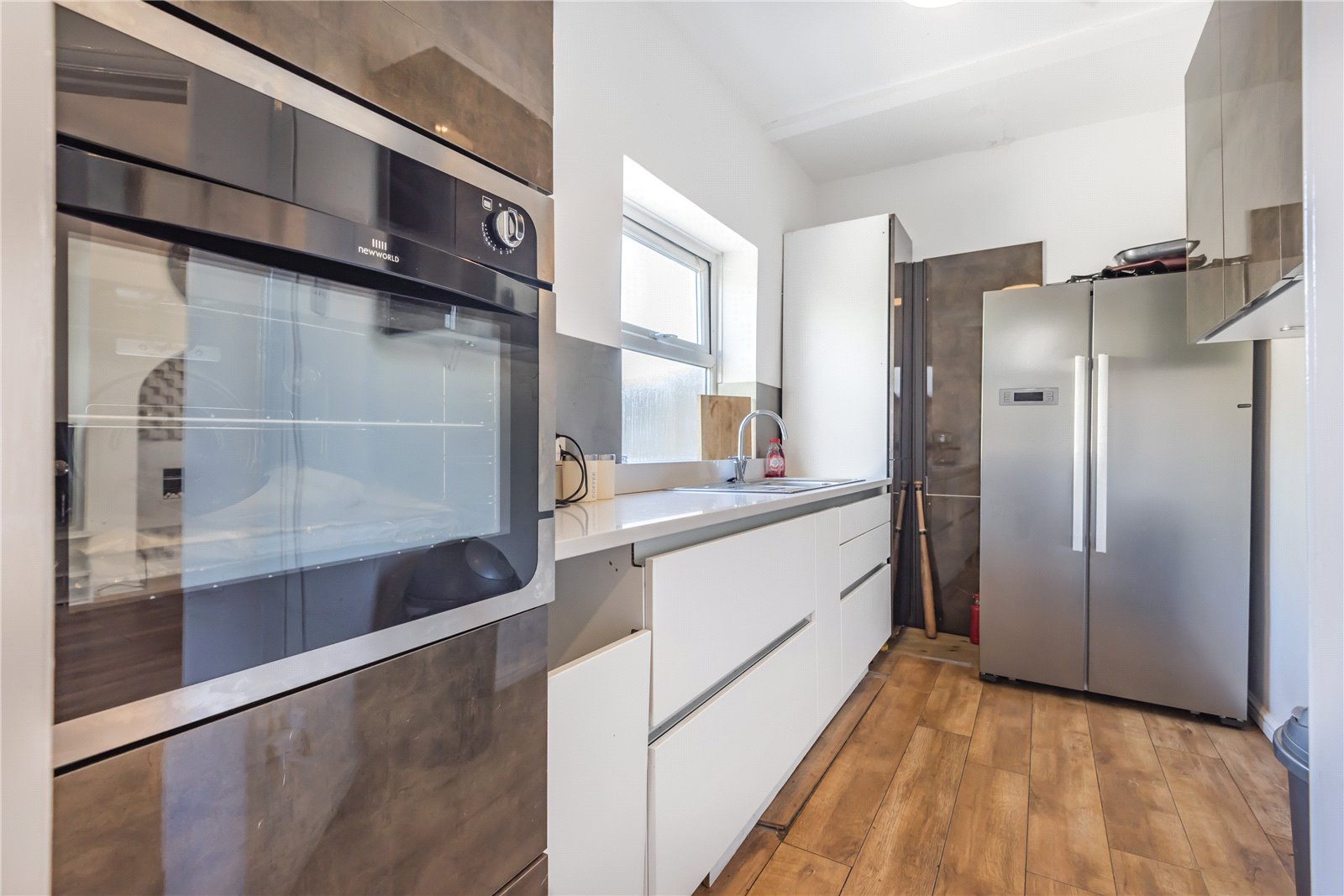 KITCHEN: Approached from entrance hall, comprising a range of high gloss kitchen cupboard and base units with work surfaces, 1 ½ stainless steel sink unit with chrome tap, new gas oven, spaces for other appliances, double glazed window.