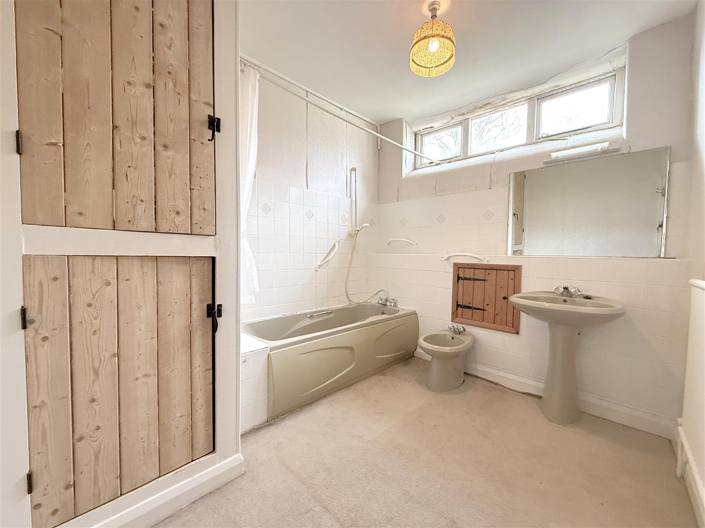 Bathroom - 2.90m x 2.51m (9'6" x 8'3") - Having a three piece coloured suite comprising panelled bath, pedestal washbasin and bidet; built in airing cupboard housing the hot water cylinder and high level window to the rear.