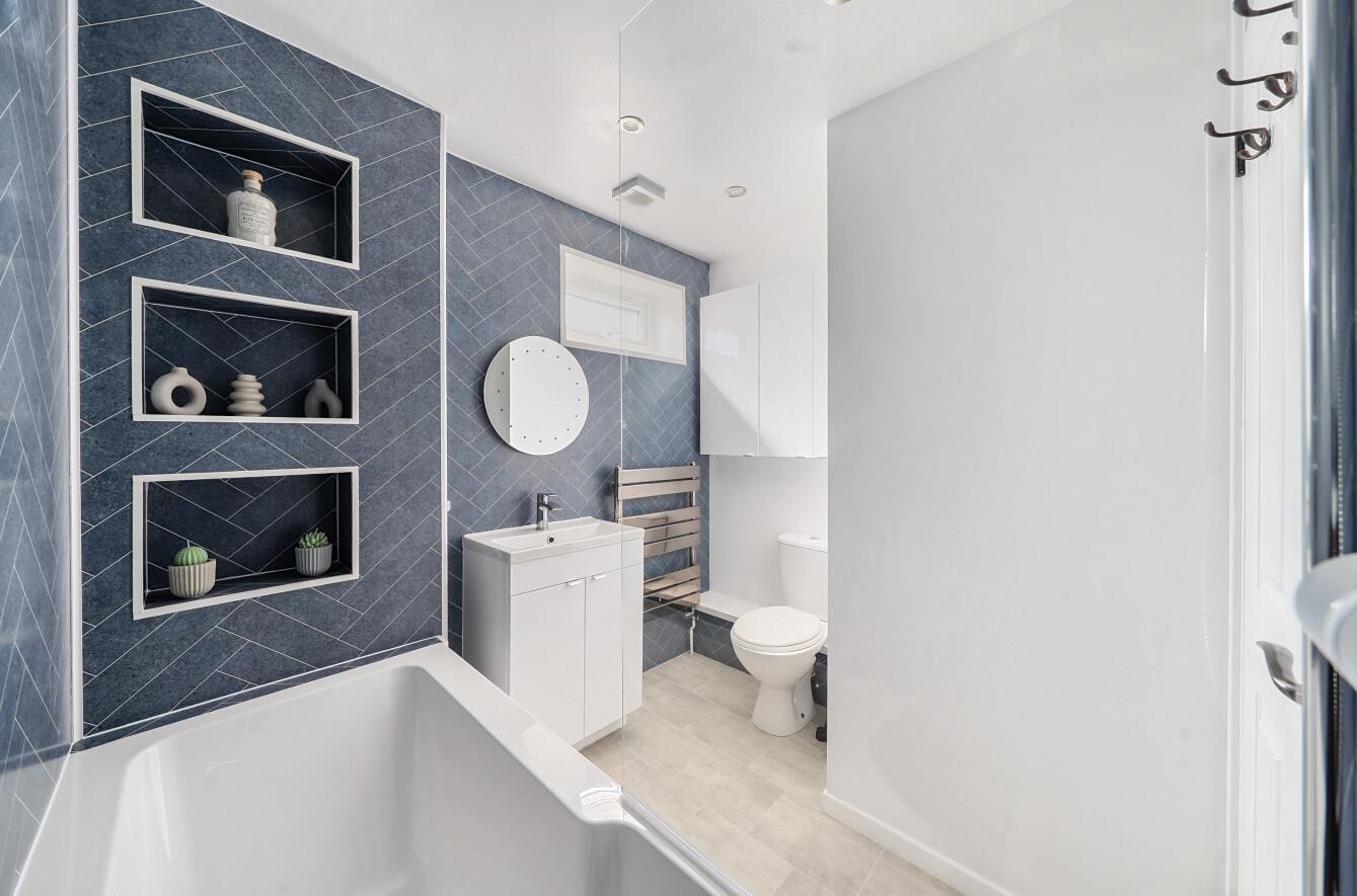 Family Bathroom: - Modern bathroom with ample storage, wc, wash basin, bath with shower over and extractor fan.