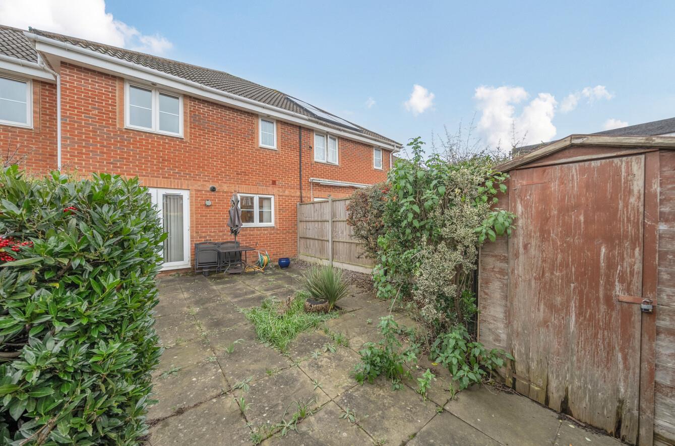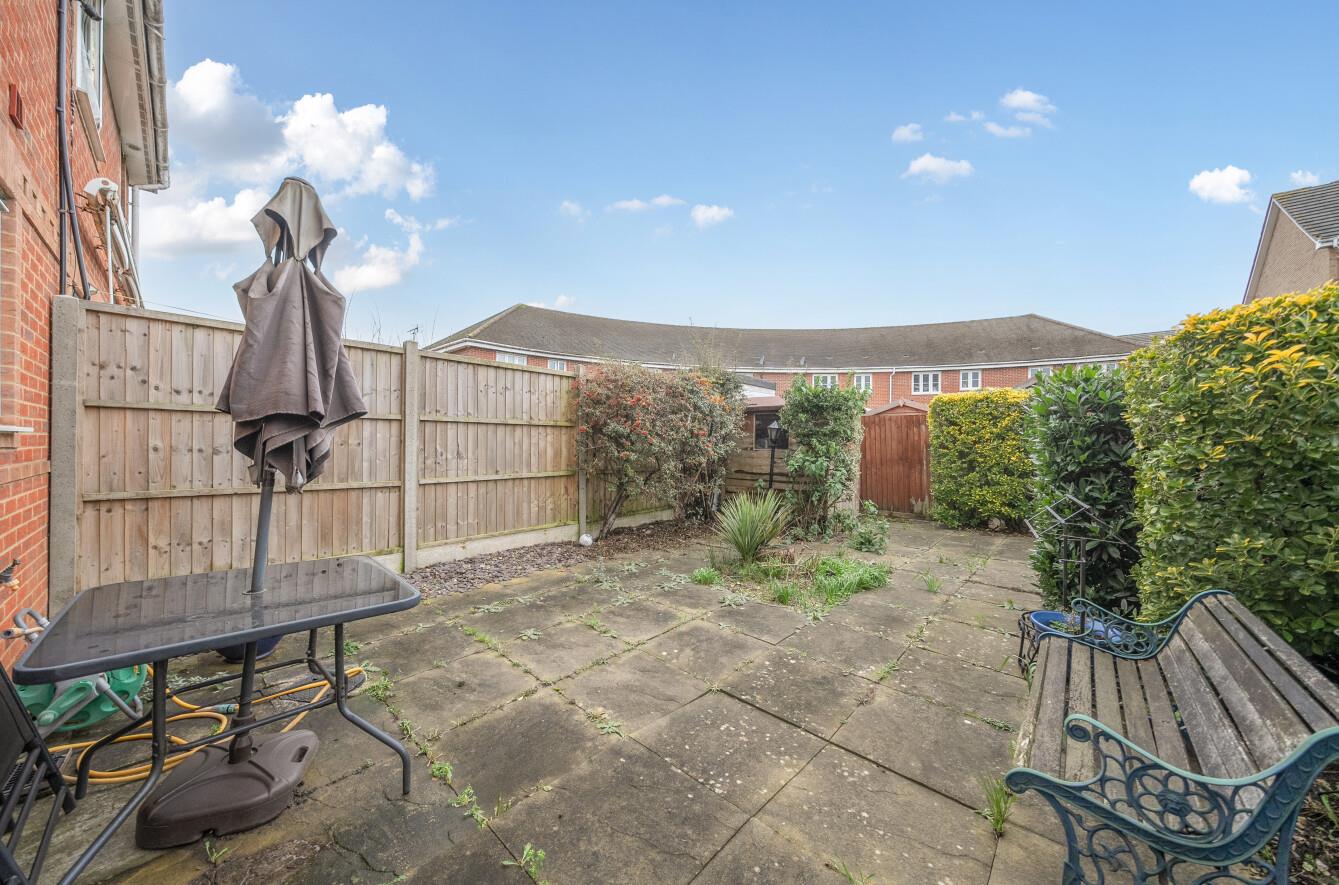 Rear Garden: - patio, fencing surrounding property with hedging and shrubs. Rear gate for access.