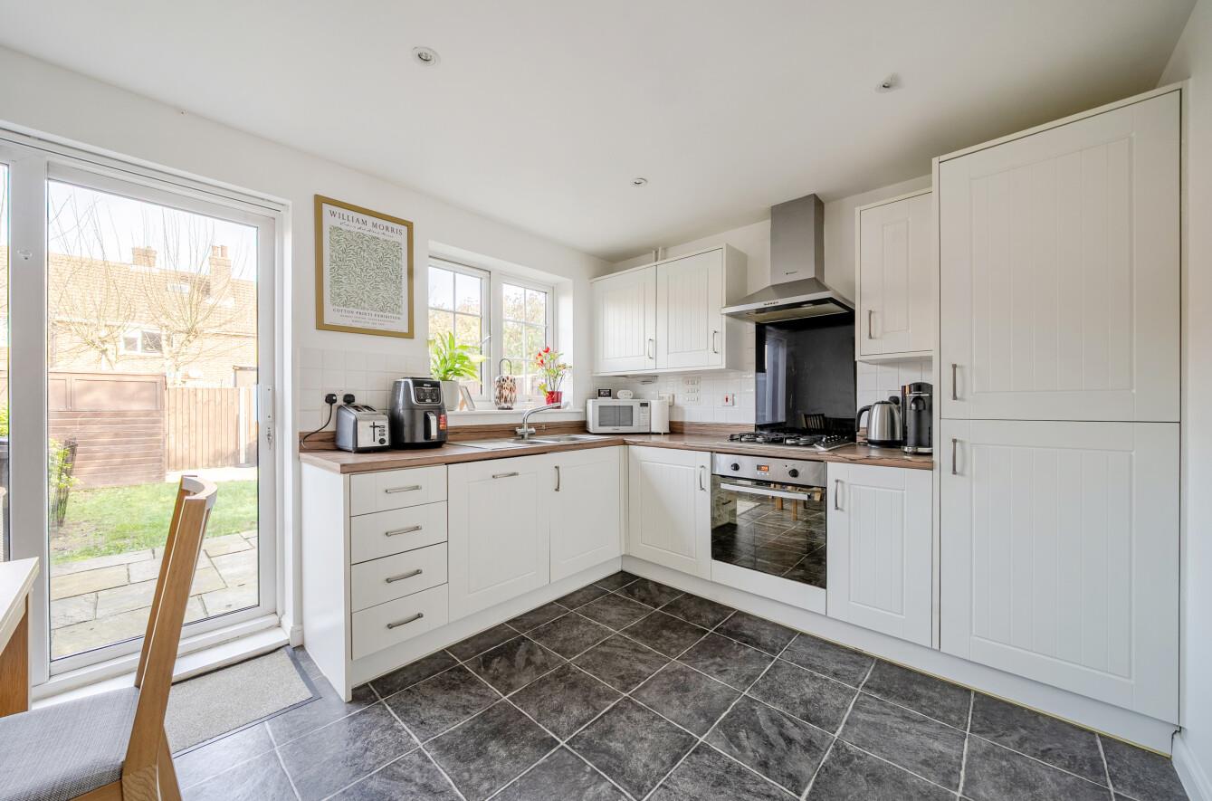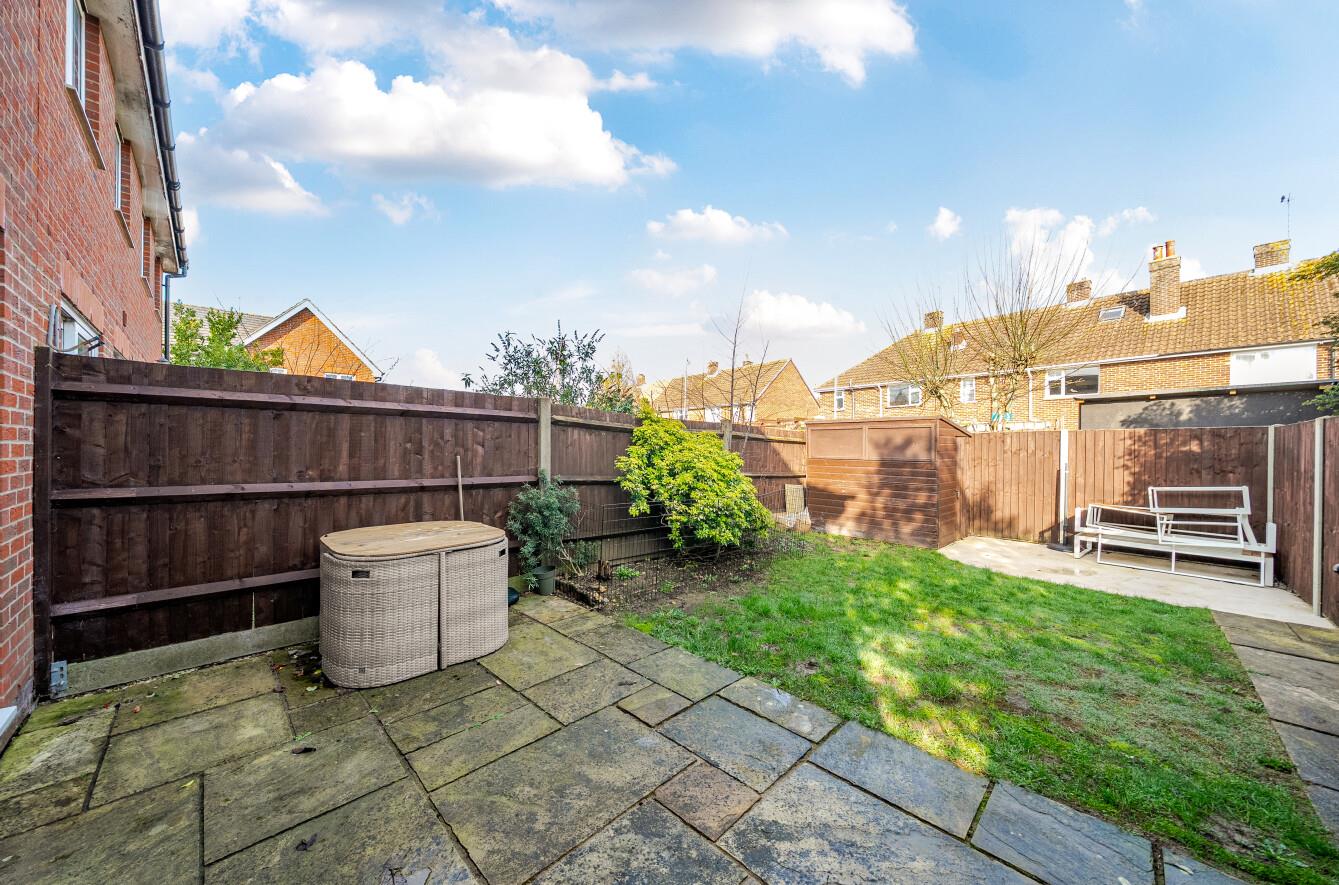 Positioned at Viscount Gardens in Eastleigh, this well-presented three bedroom end-terrace home offers balanced accommodation and practical storage throughout. You enter via a welcoming hallway with a convenient cloakroom, leading through to a generously proportioned sitting room to the front of the home. Across the rear, the kitchen/dining room stretches the width of the property, creating a sociable space for everyday living and dining while overlooking the garden. Upstairs, three bedrooms are arranged around the landing, with the principal bedroom benefitting from an ensuite, alongside a separate family bathroom. Each bedroom includes either fitted or built-in wardrobe storage, helping maximise usable space. Outside, parking is available to the front. The rear garden has been landscaped to create two patio seating areas with a lawned section between, offering a flexible outdoor setting. The location is particularly convenient, being close to Lakeside Country Park and within easy reach of Southampton Airport Parkway, supporting straightforward rail connections towards London.