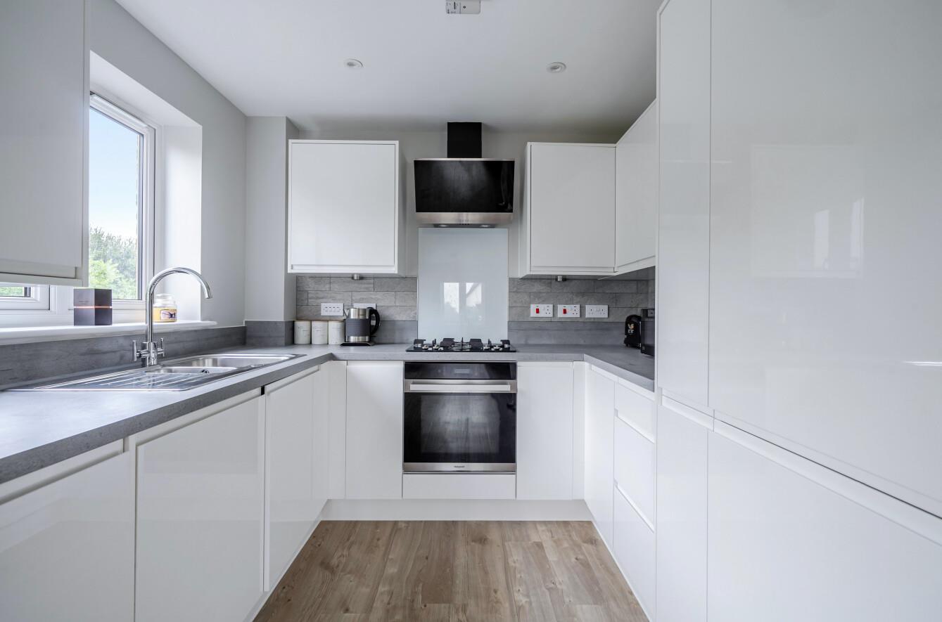 Kitchen/Dining/Sitting Room: - 26'7" x 11'8" (8.10m x 3.57m) Dual aspect windows, feature wooden wall. The kitchen area is fitted with a range of modern white gloss units, electric oven, gas hob with extractor hood over, integrated fridge/freezer, dishwasher and washer dryer, cupboard housing boiler.