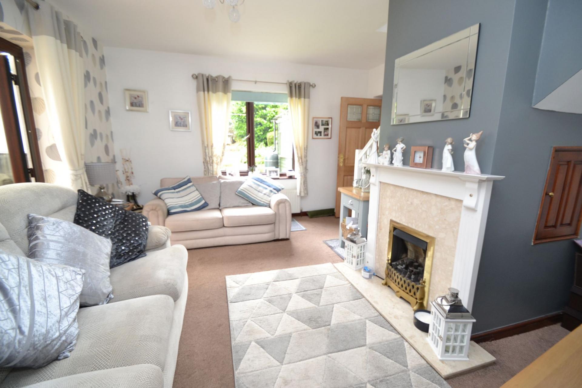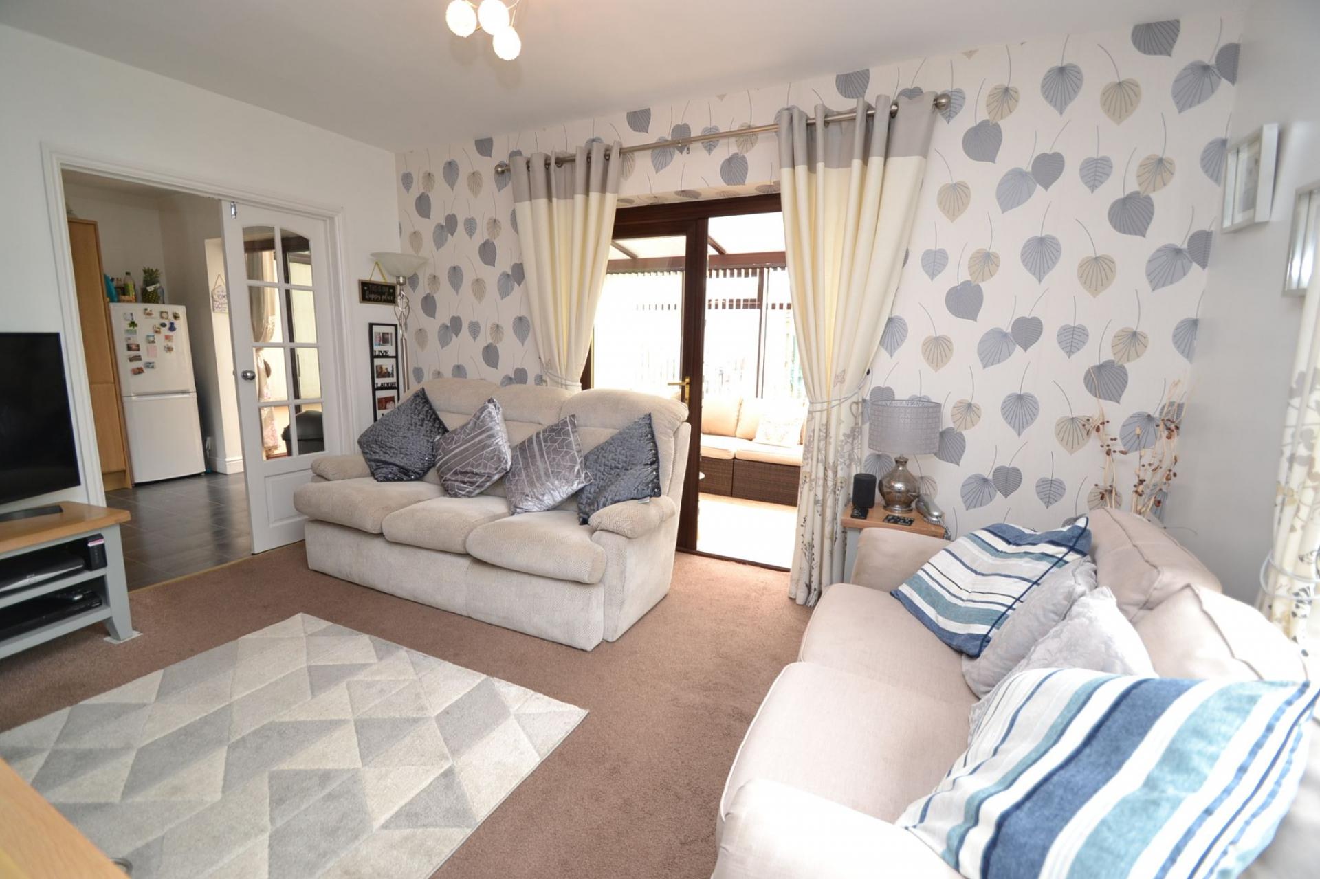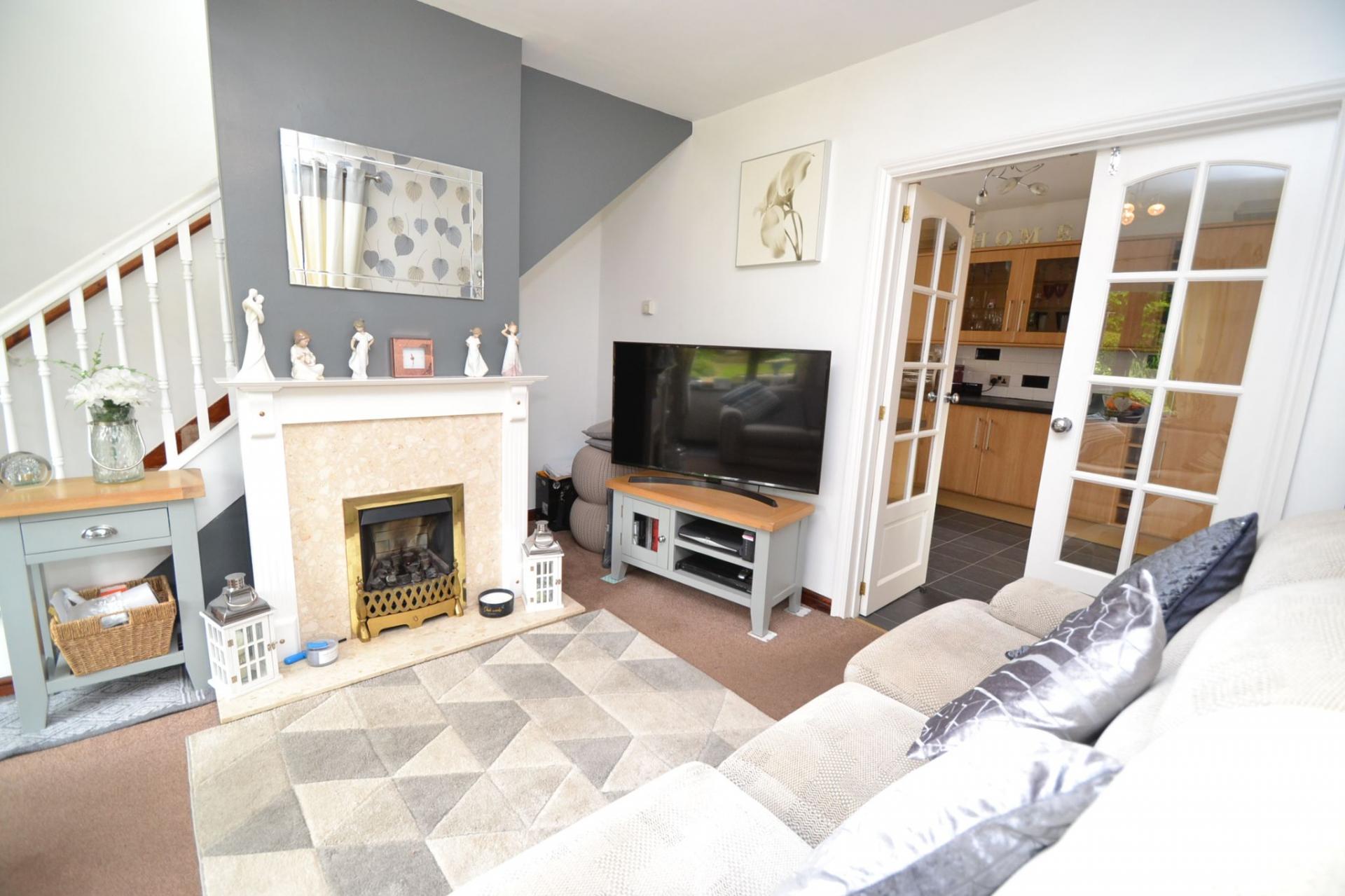 Lounge: 4.31m x 3.91m (14'1 x 12'8). Upvc dg window, radiator, Adam style fireplace surround with a marble back & hearth & living flame coal gas fire, thermostat control, cupboard storage, sliding patio doors, French glazed doors lead onto the:-