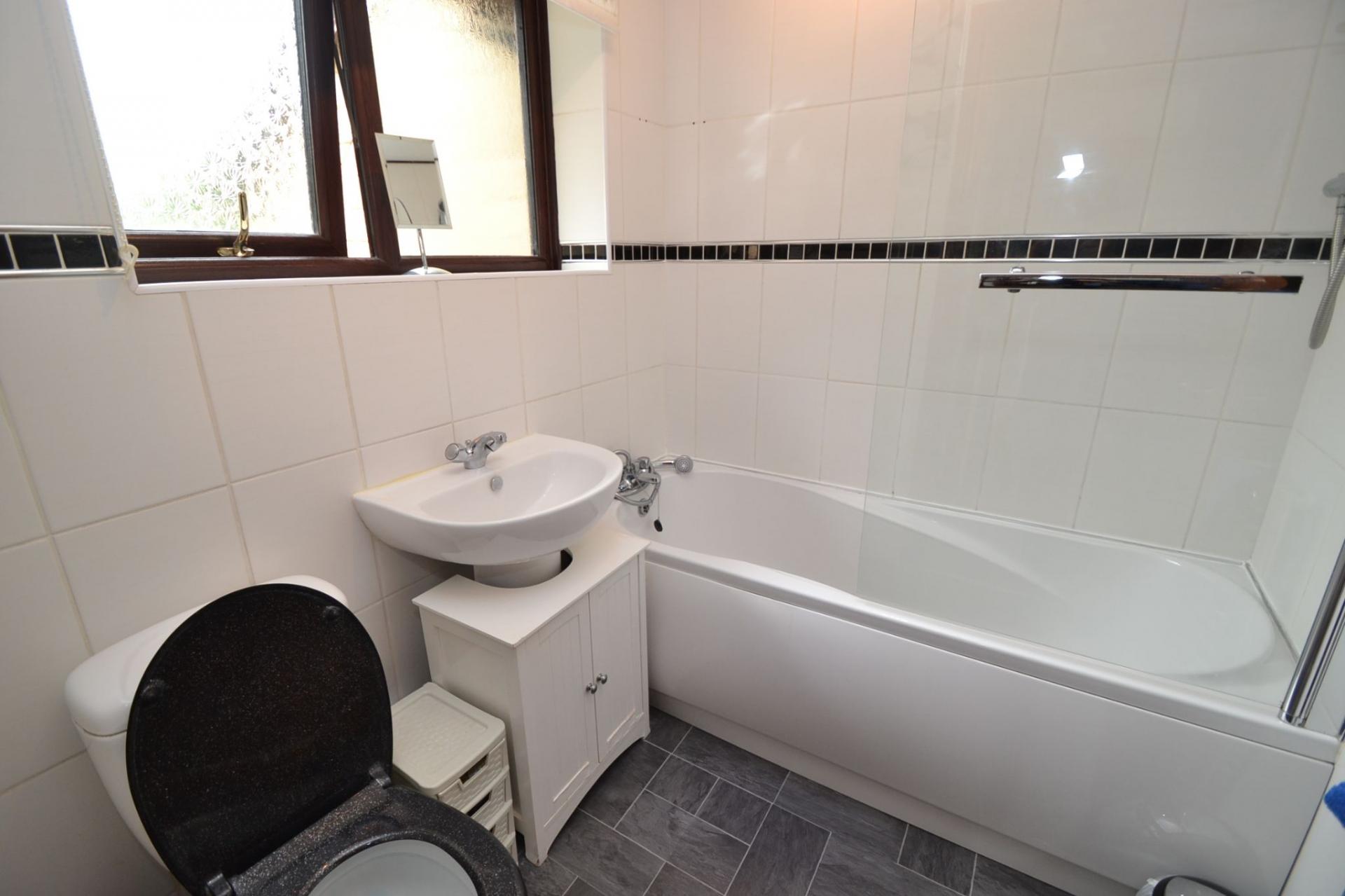 Bathroom: 1.93m x 1.68m (6'3 x 5'5). Three piece suite in white, chrome mixer shower tap, thermostatically controlled chrome shower unit over the bath, shower screen, fully tiled, Upvc dg frosted window, heated chrome towel rail.