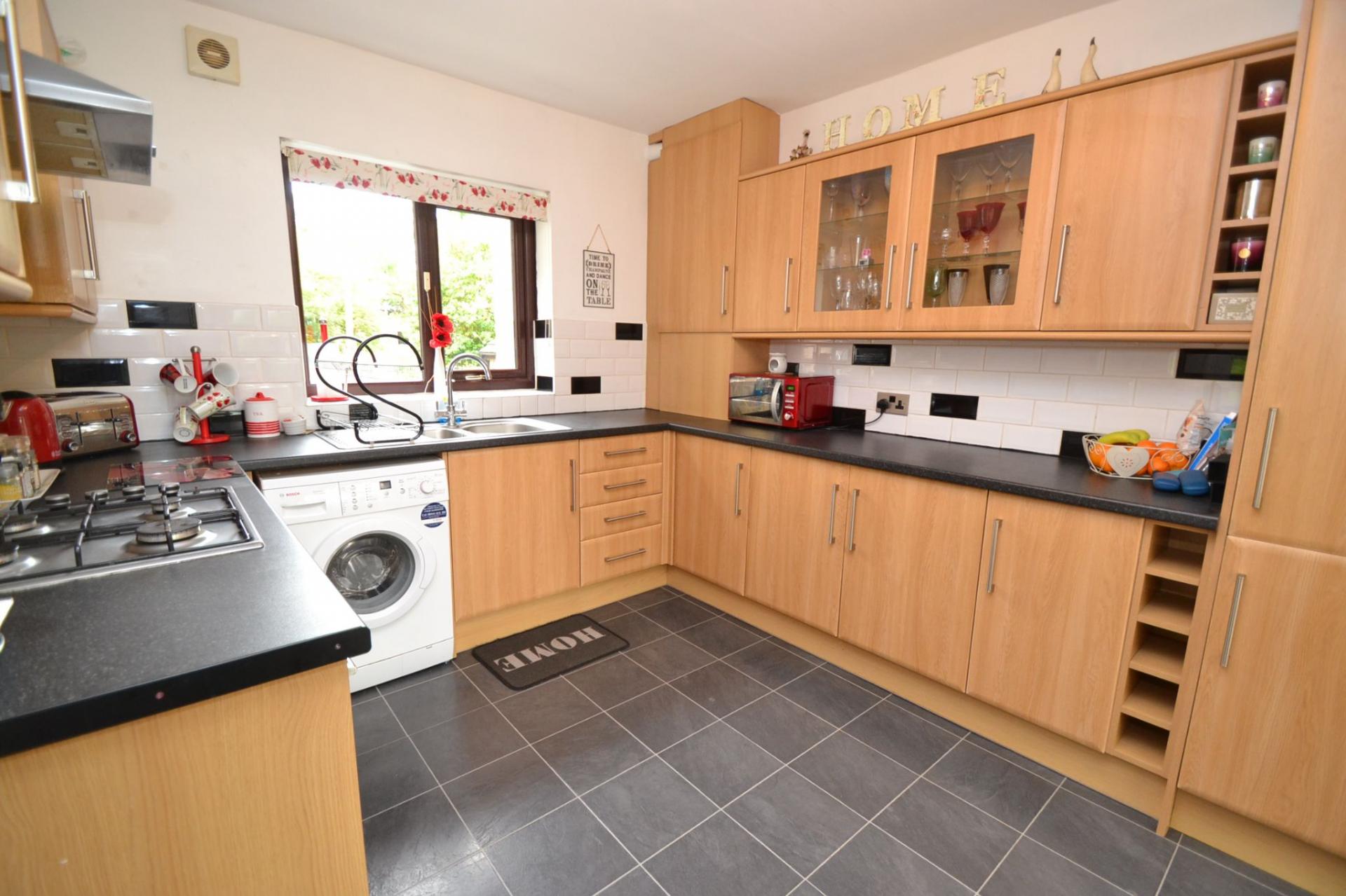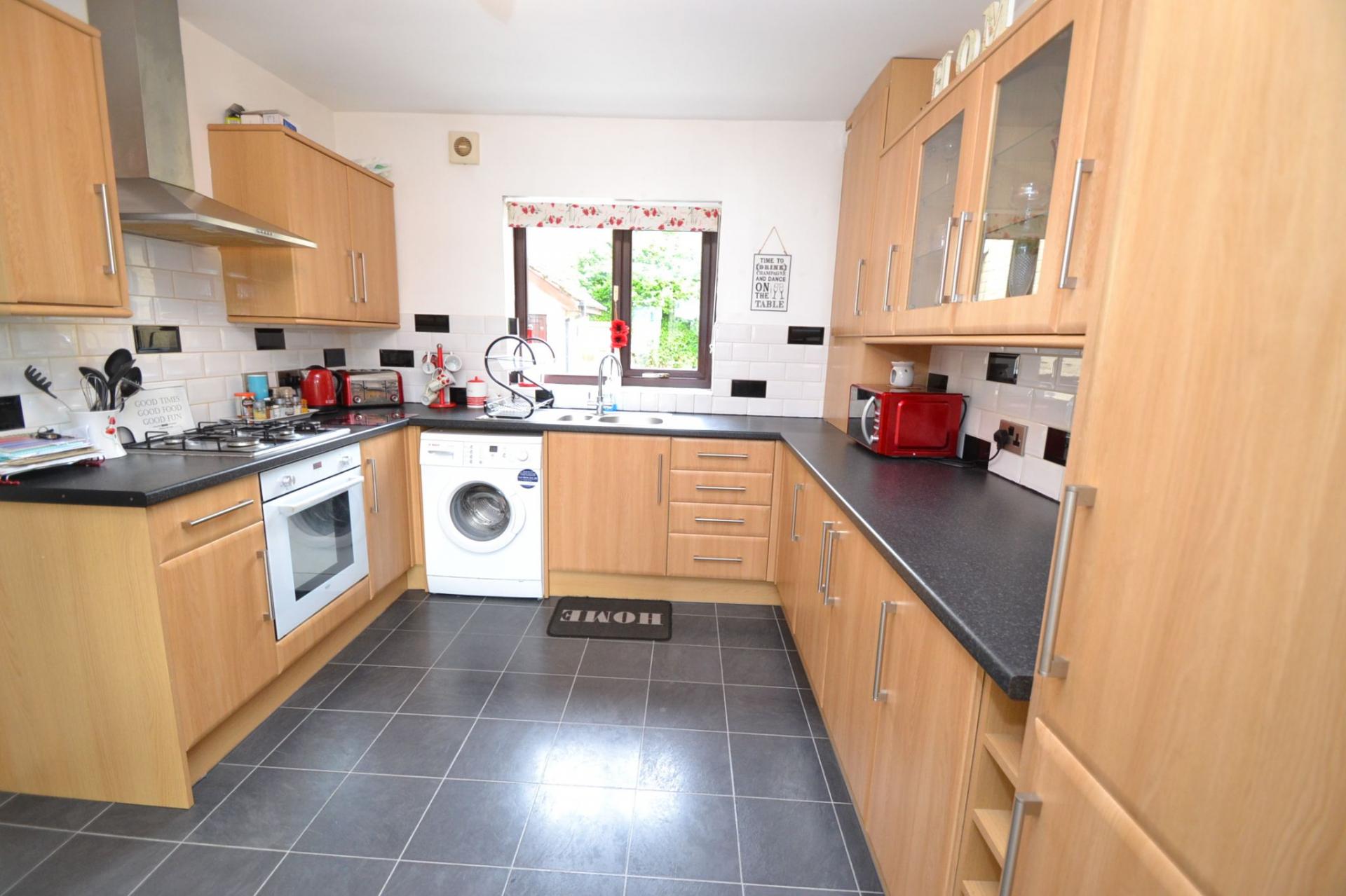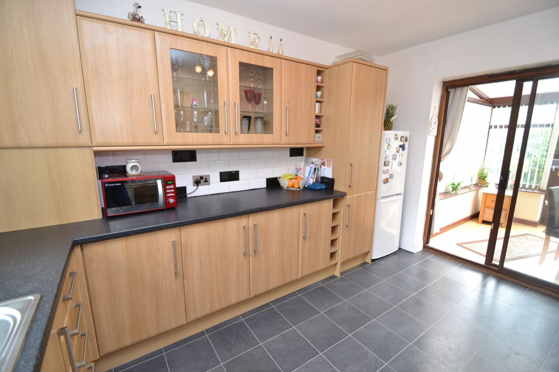 Kitchen: 3.91m x 3.01m (12'8 x 9'8). Excellent range of wall & base units in beech, granite effect work tops with contrasting brick tiling above, Upvc dg window, stainless steel 1.5 sink with a mixer tap, plumbed for an auto-washer, stainless steel extractor over a 4 ring stainless steel gas hob, built in recently installed Bush electric cooker, space for a tall boy fridge freezer, radiator, sliding patio doors lead onto the:-