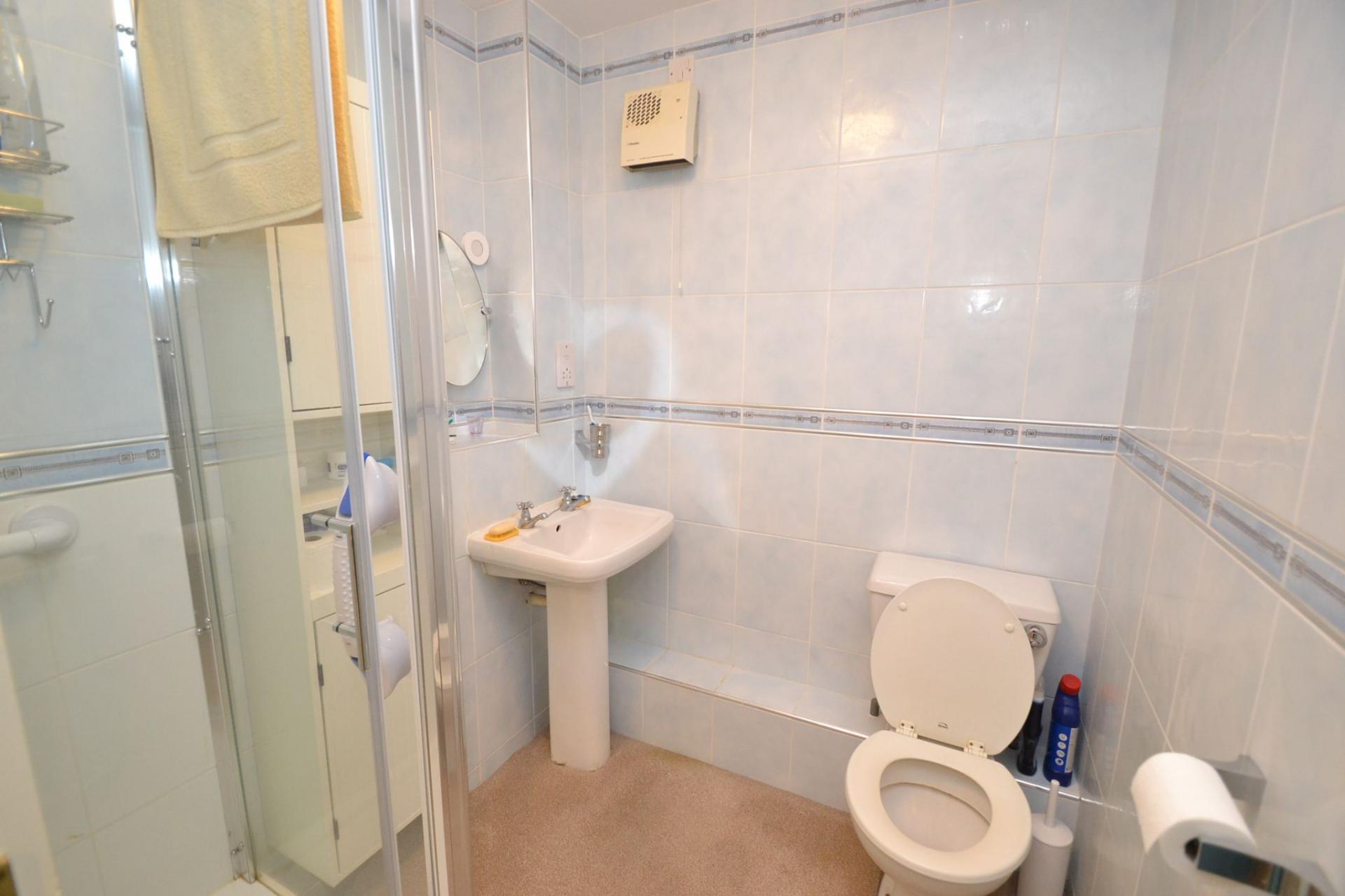 Shower Room: 2.34m x 1.75m (7'6 x 5'7). Fully tiled, walk in shower cubicle with a sliding screen and electric shower, wash basin and wc in white, Dimplex wall heater, extractor.