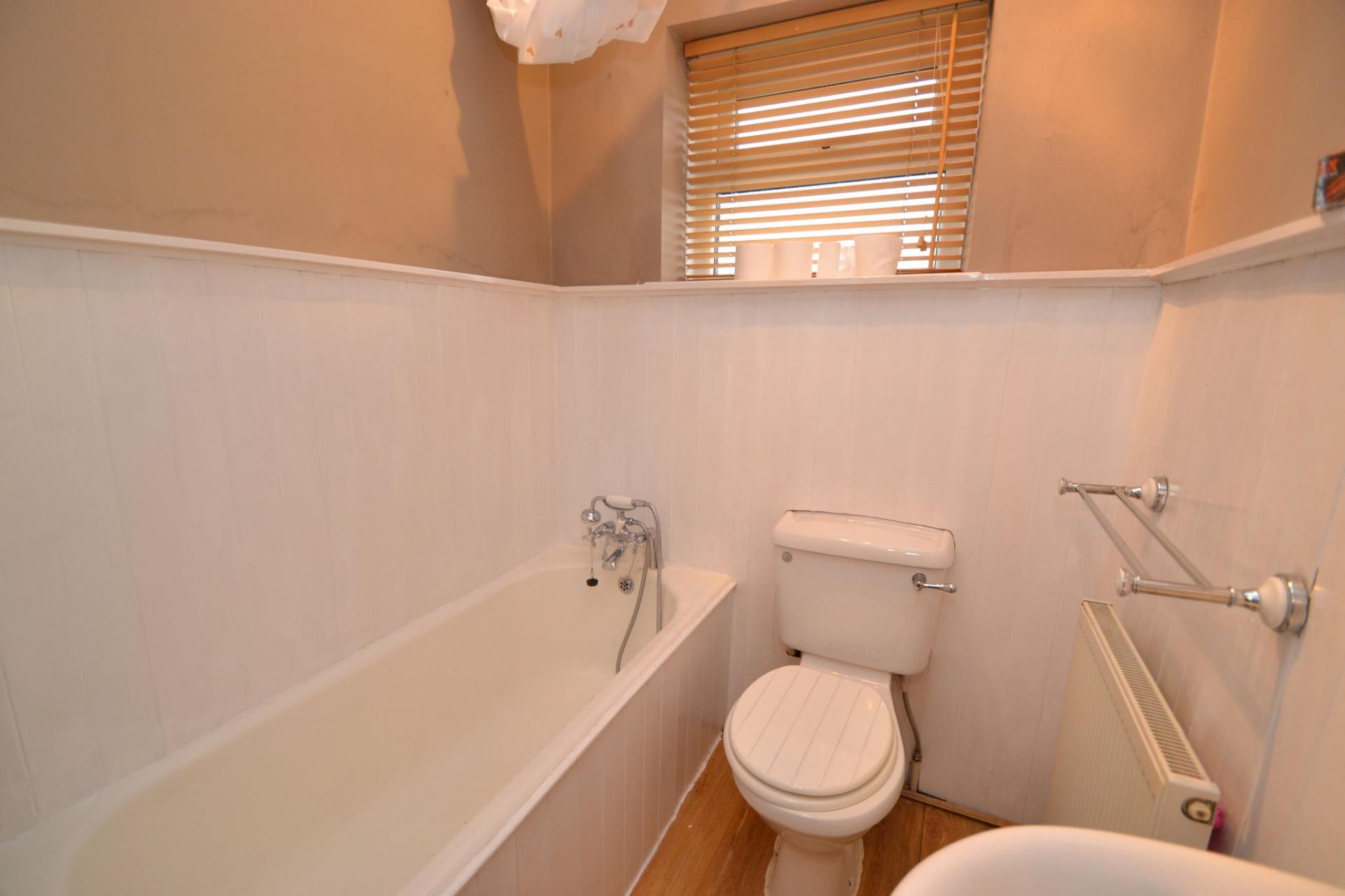 Bathroom: Three piece suite in white, telephone mixer shower tap, shower rail and curtain, part painted cladded to the walls, radiator, frosted Upvc dg window.