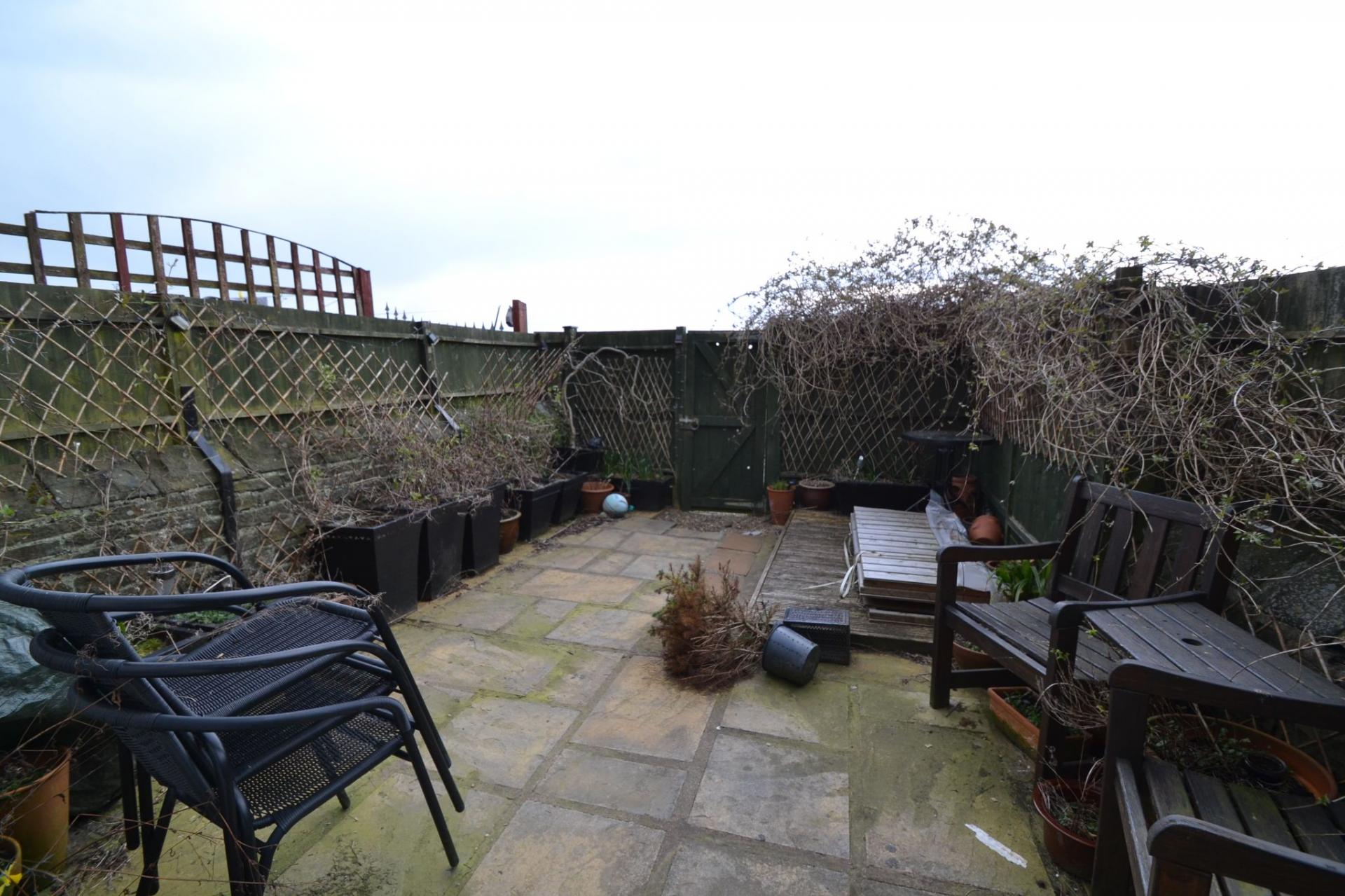 Externally: Low wall frontage with a pathway, blue slated garden. To the rear is an enclosed level flagged garden with planted borders, fencing and gated access.