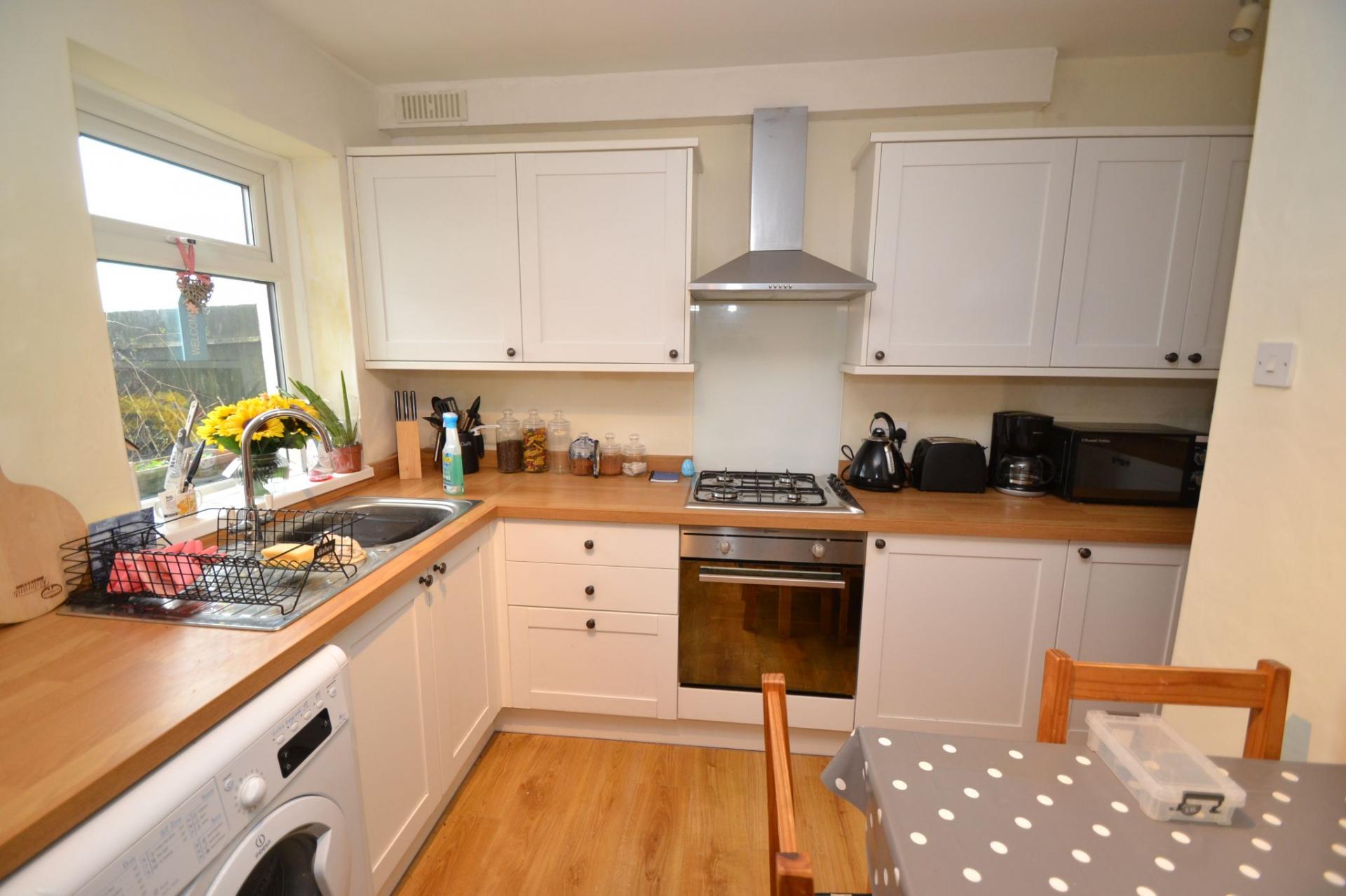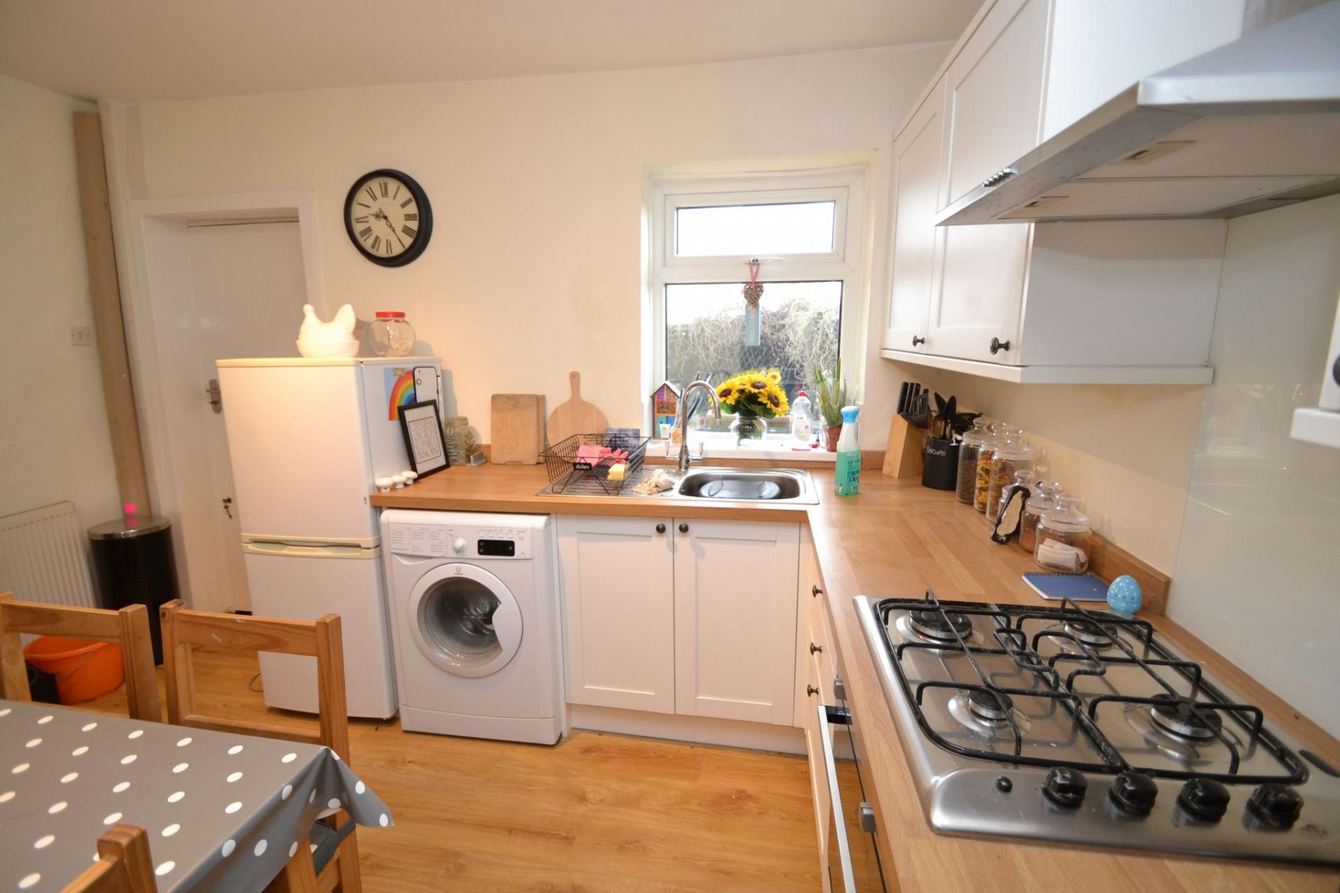 Kitchen Dining Room: 3.79m x 2.47m (12'4 x 8'1). Modern range of wall & base units with wood work tops and matching splash backs, stainless steel extractor and glass splash back, 4 ring gas hob plus integrated electric oven all in stainless steel, plumbed for an auto-washer, space for a tall boy fridge freezer, stainless steel sink, radiator, area for a small table and chairs, recessed area under the stairs with a base unit, Upvc dg window plus rear entrance door onto a rear porch.
