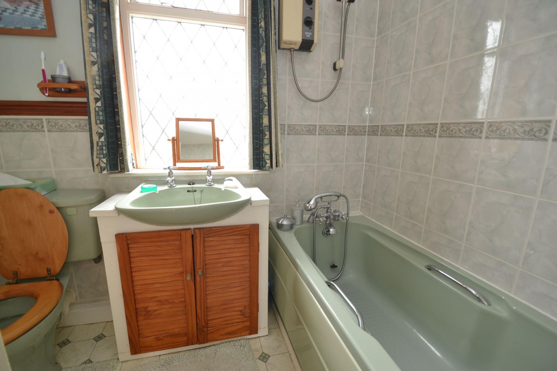 Bathroom: Three piece coloured suite in Eucaliptus with a mixer tap, Triton T80 electric shower over the bath, part tiled, radiator, frosted dg wood window.
