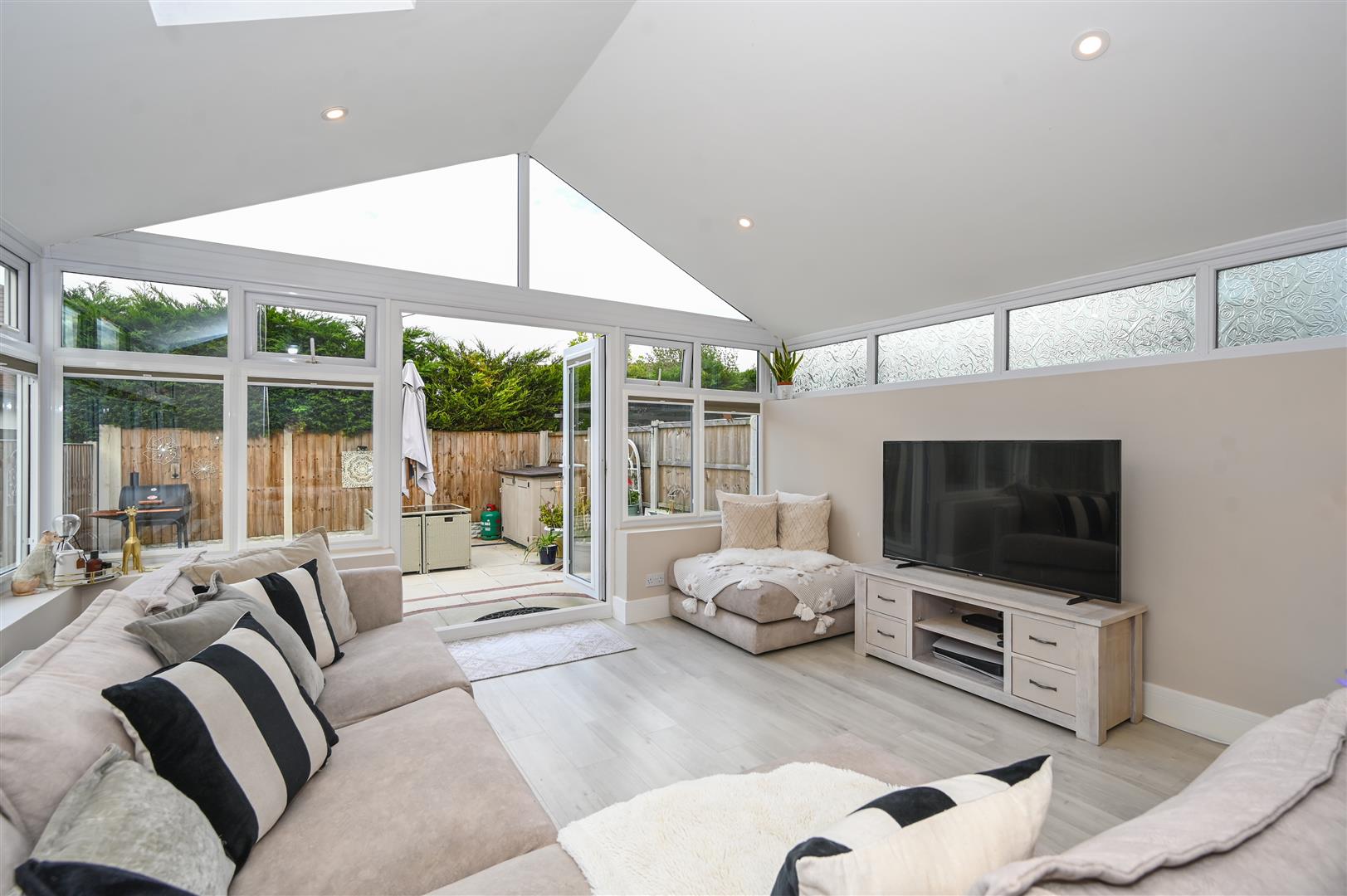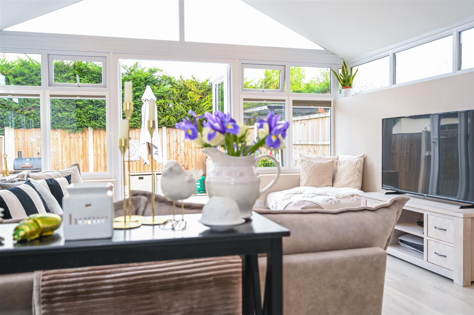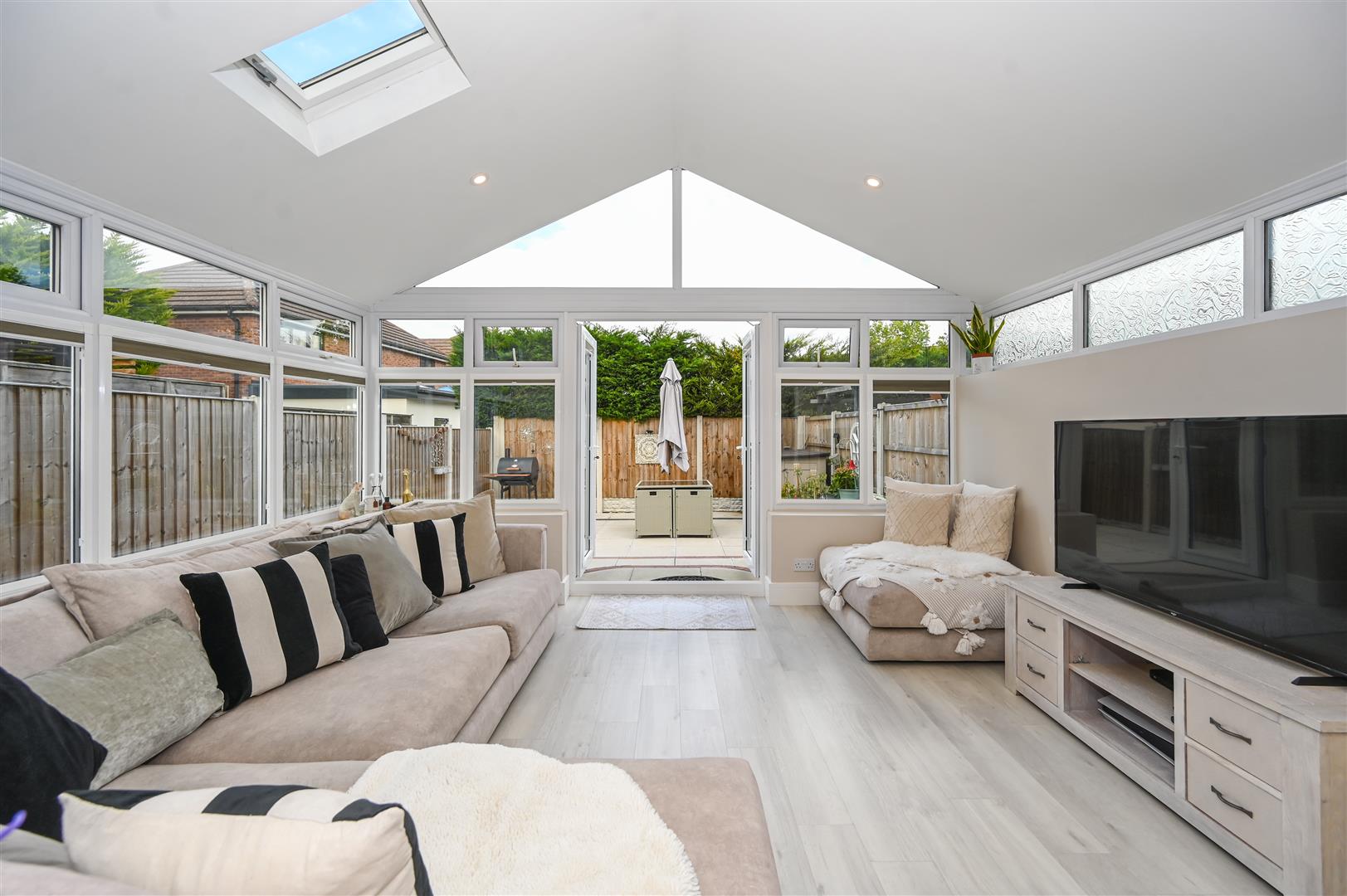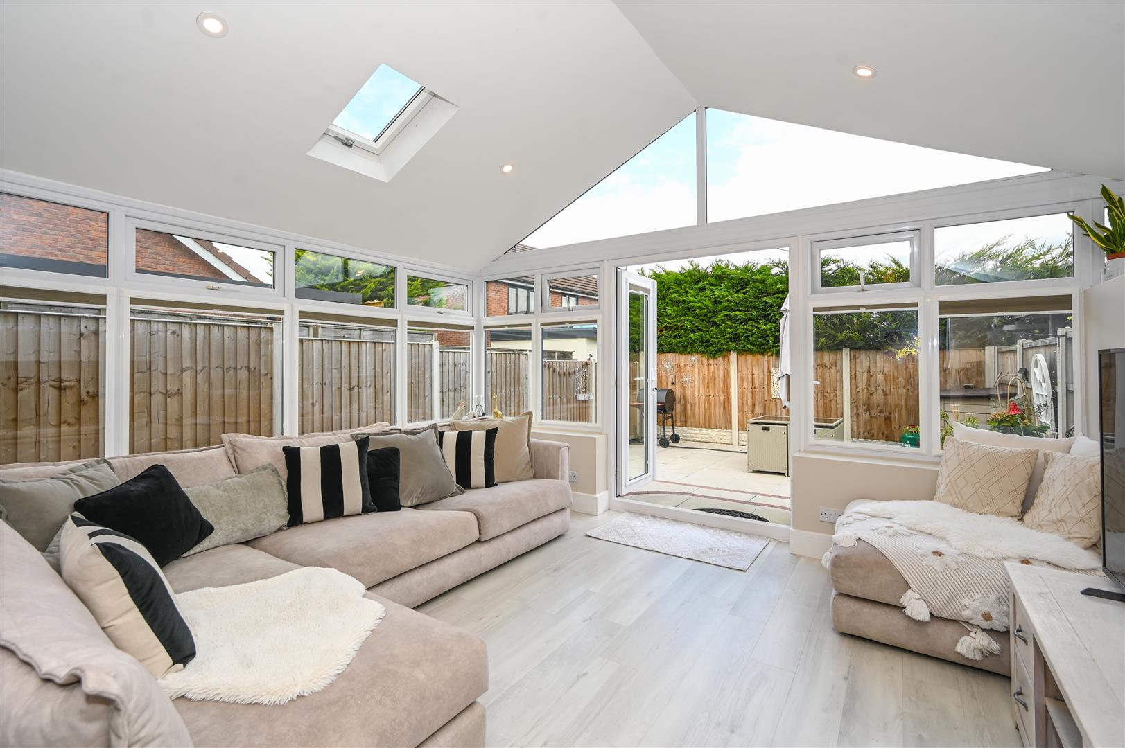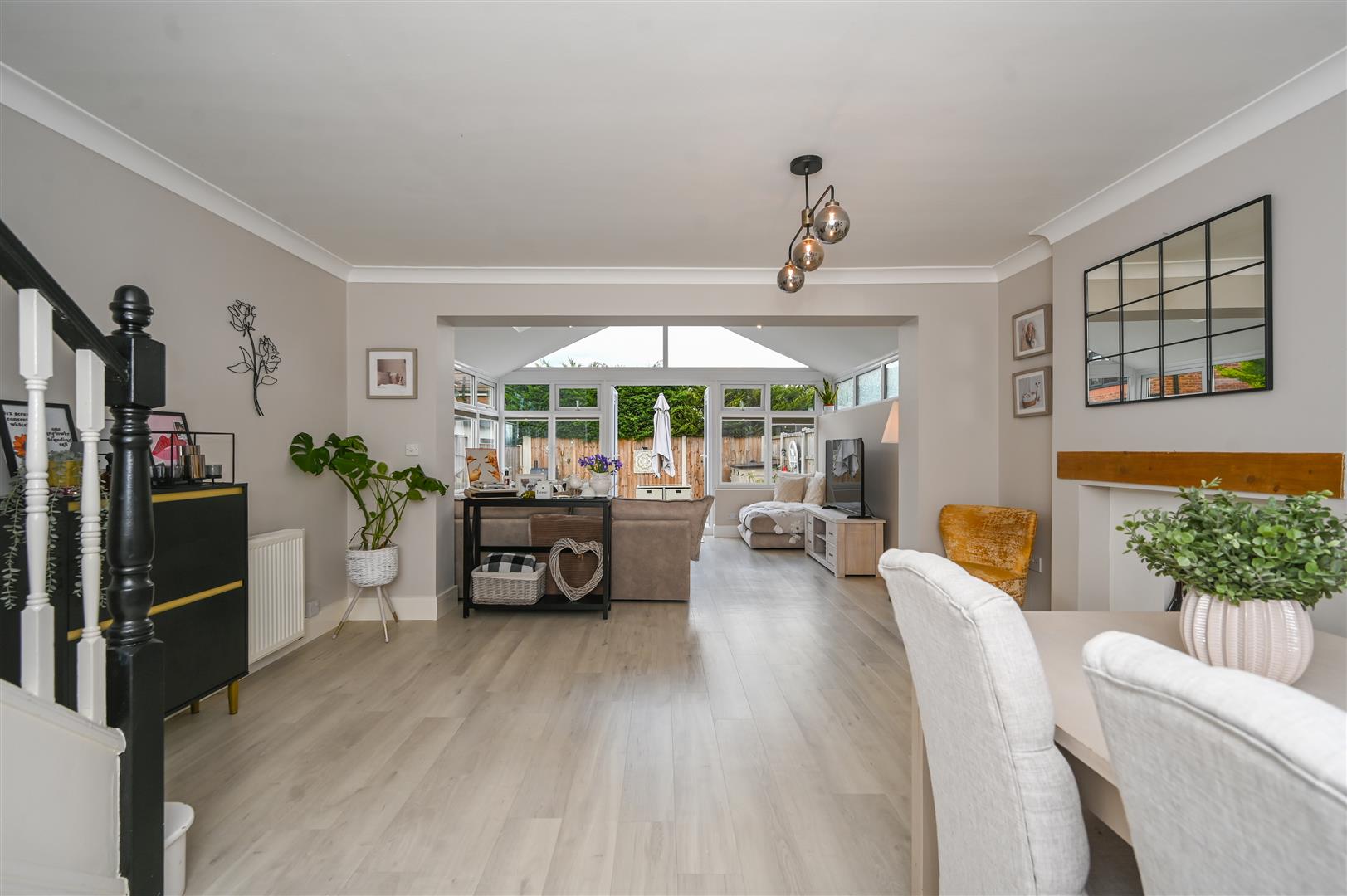 The former conservatory has been fully converted with a solid roof, creating a fantastic additional reception space ideal for dining, relaxing, or entertaining.