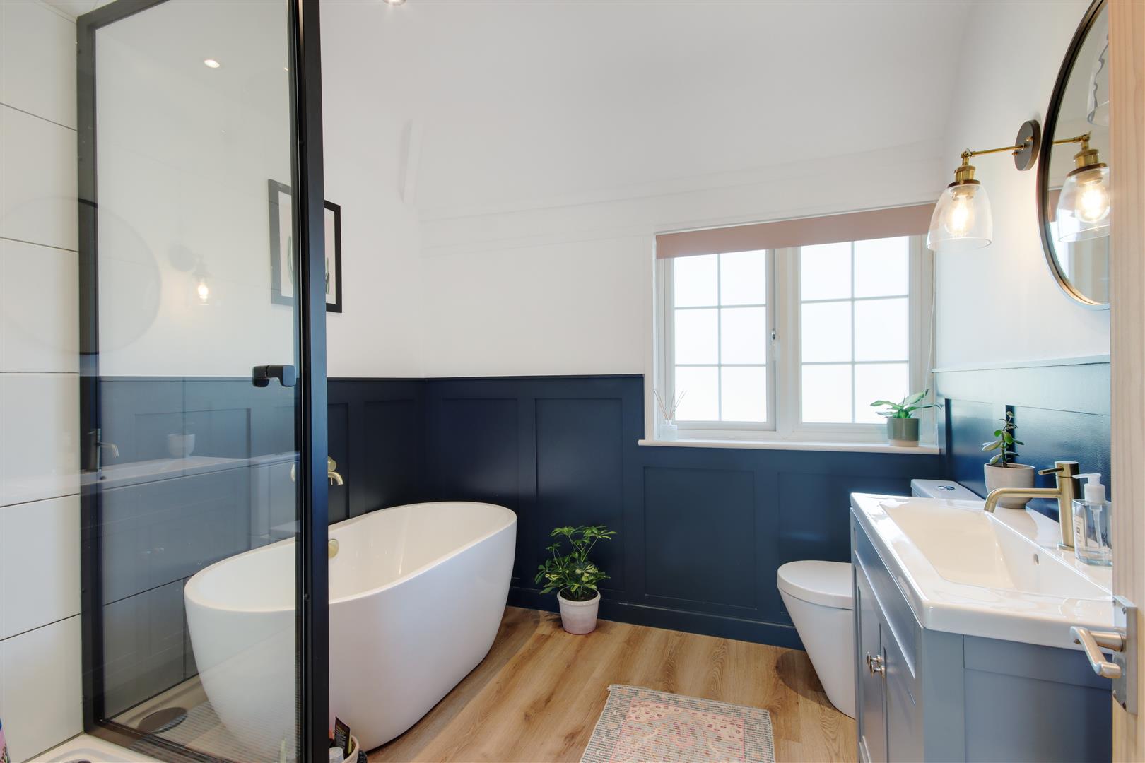 . Striking contemporary refitted family bathroom fitted with a white suite comprising white freestanding bath, vanity basin with painted cupboard, walk in shower enclosure, Mira thermostatic shower with rainfall head, metro tiled splashback and gold fittings. Painted wall panelling to half height and wood effect engineered vinyl flooring.
