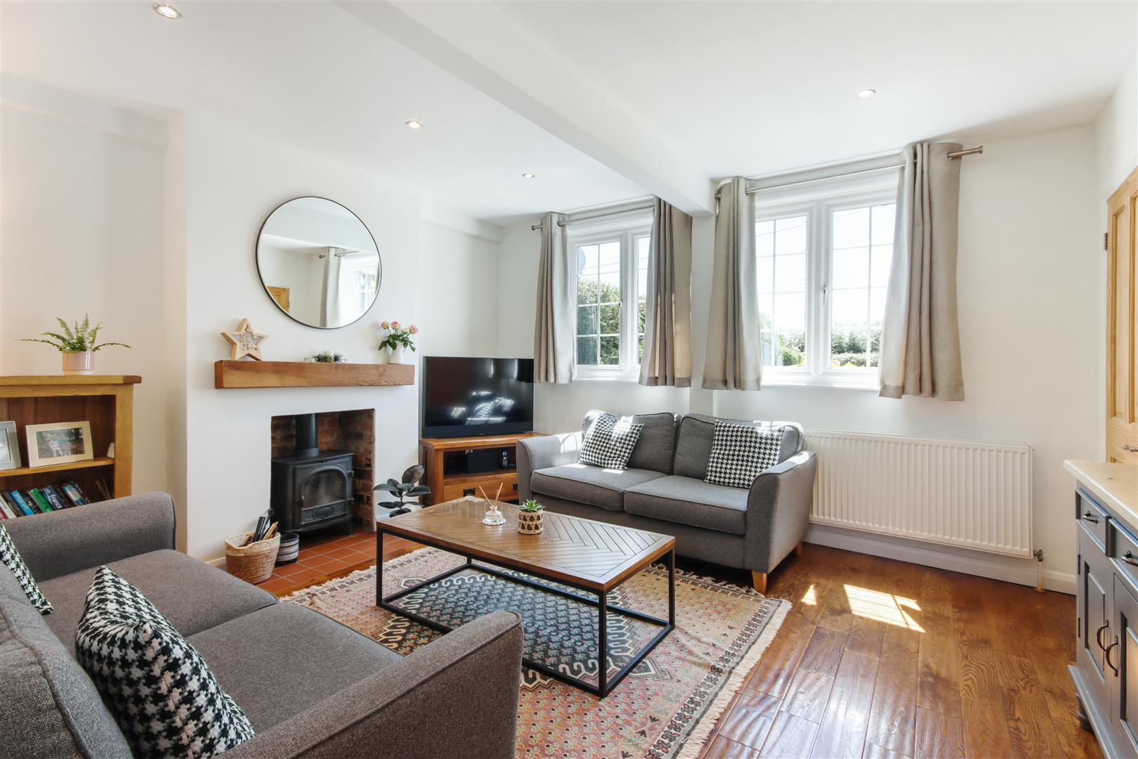 . Charming sitting room with aspect to front, central open fireplace with red quarry tiled surround and wood burning stove. Smart engineered oak flooring.