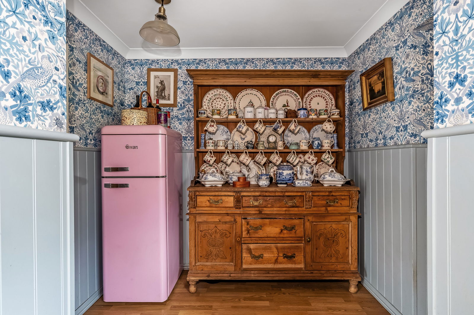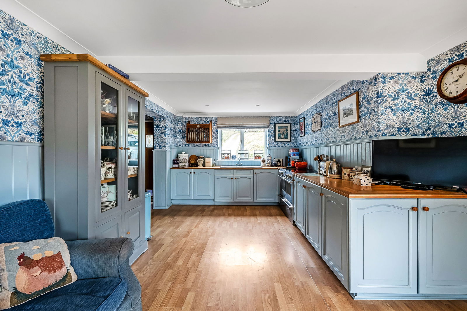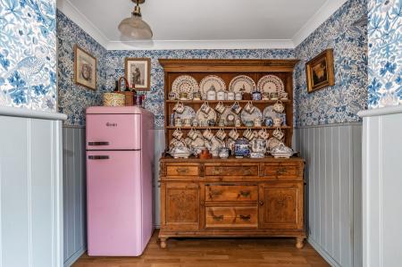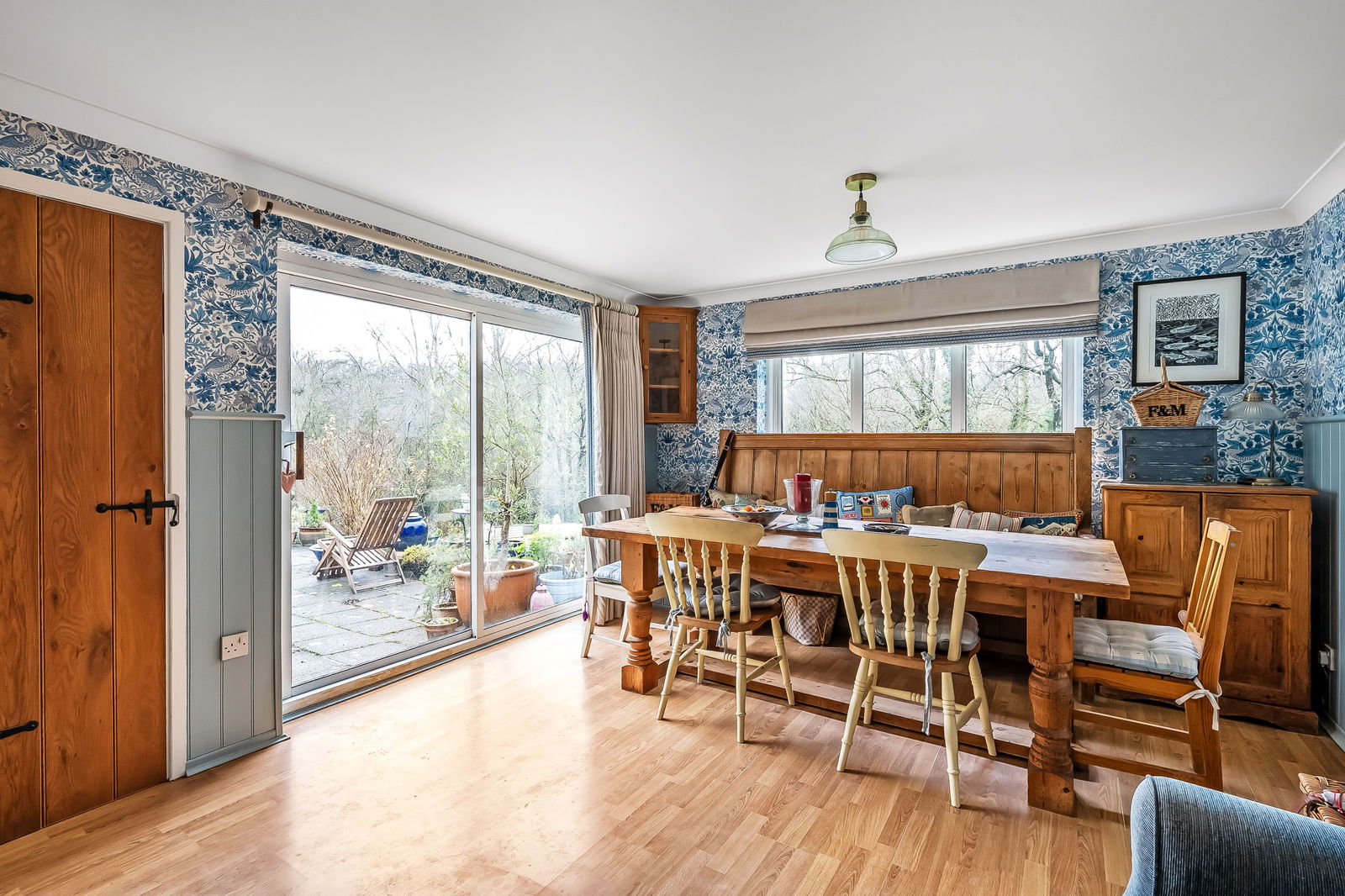 -Triple Aspect Farmhouse style Kitchen/Dining Room. Extensive range of timber working surfaces with cupboards and draws below, equipment space, double sliding patio doors to garden.