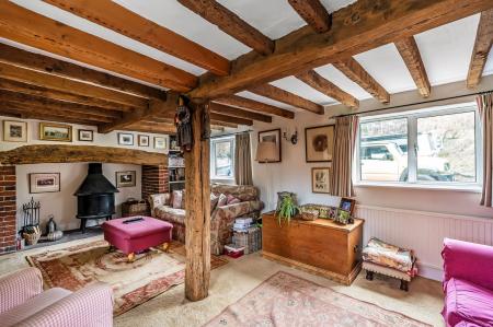 -Impressive Double Aspect Sitting Room. Heavy exposed ceiling timbers, inglenook fireplace with woodburning stove, door to: