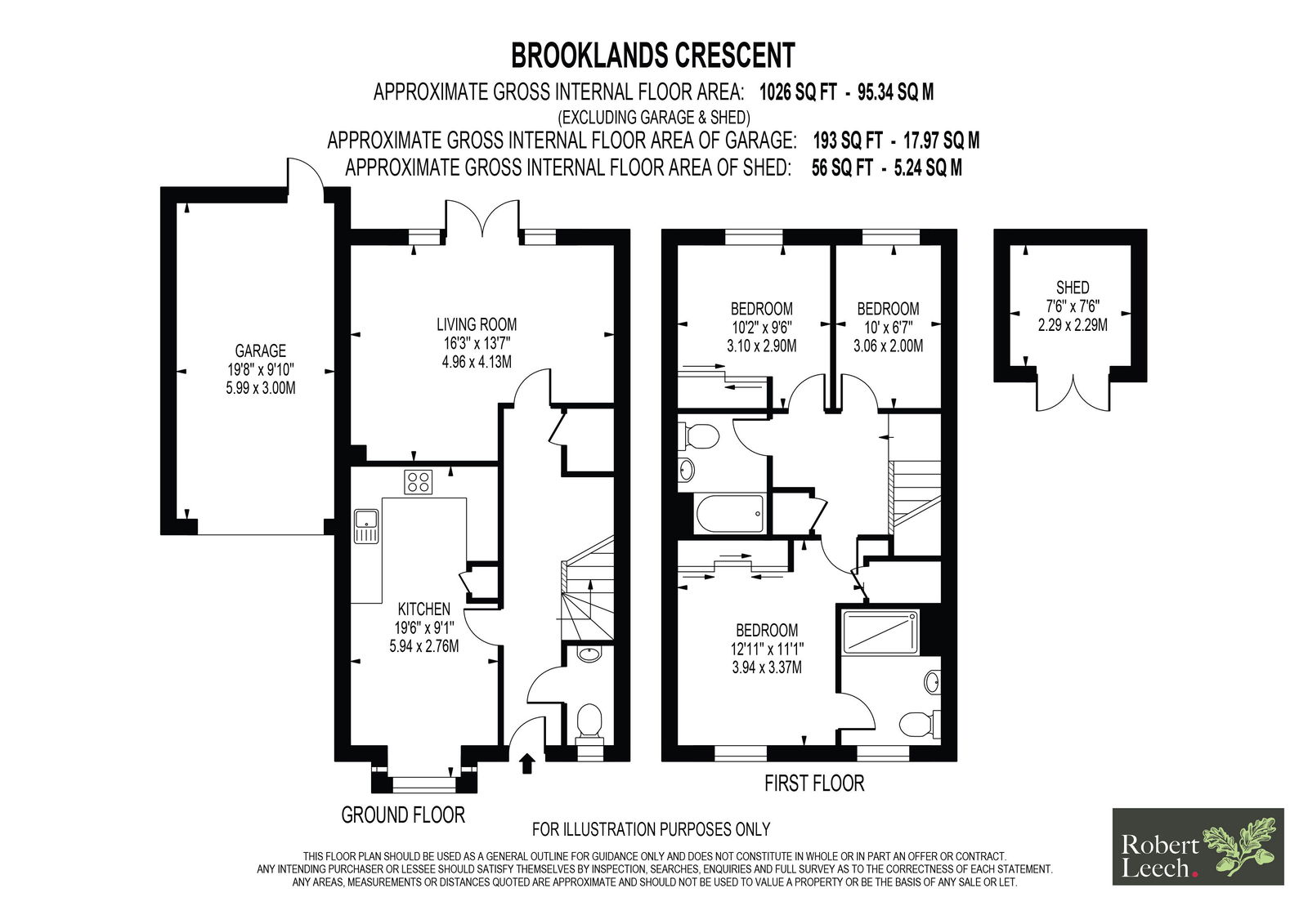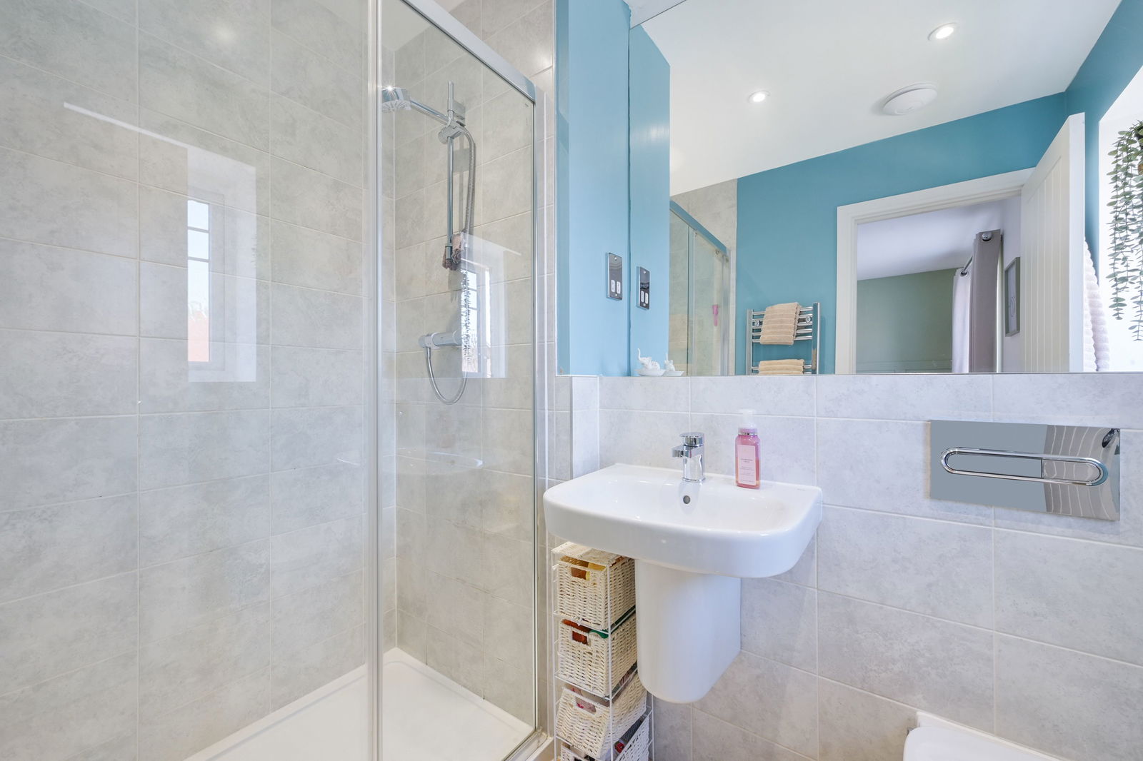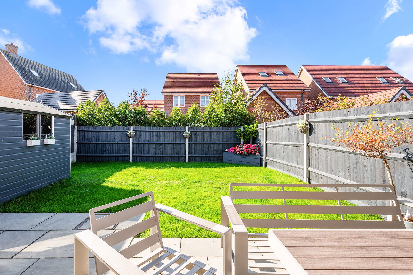 Upstairs, the master bedroom features built-in storage and a sleek en-suite shower room. Two further bedrooms are served by a modern family bathroom. The rear garden is fully enclosed and offers a patio seating area, lawn, shed, and access to the garage.