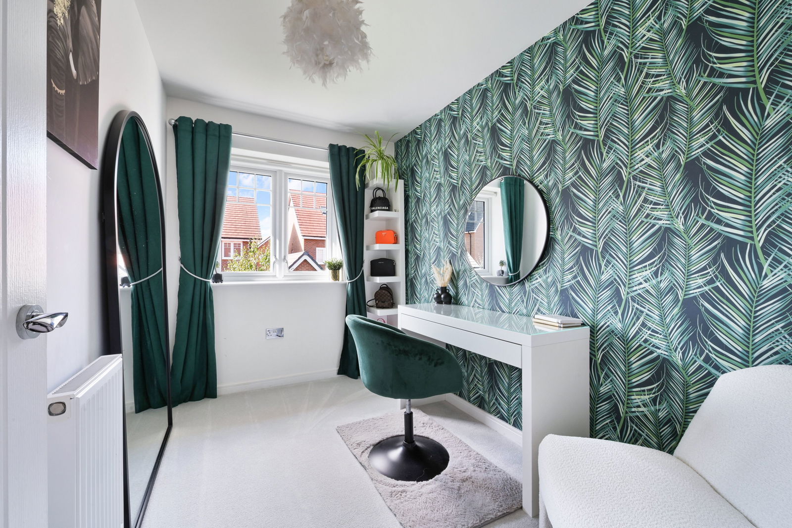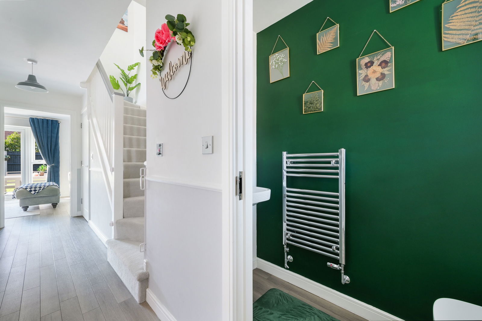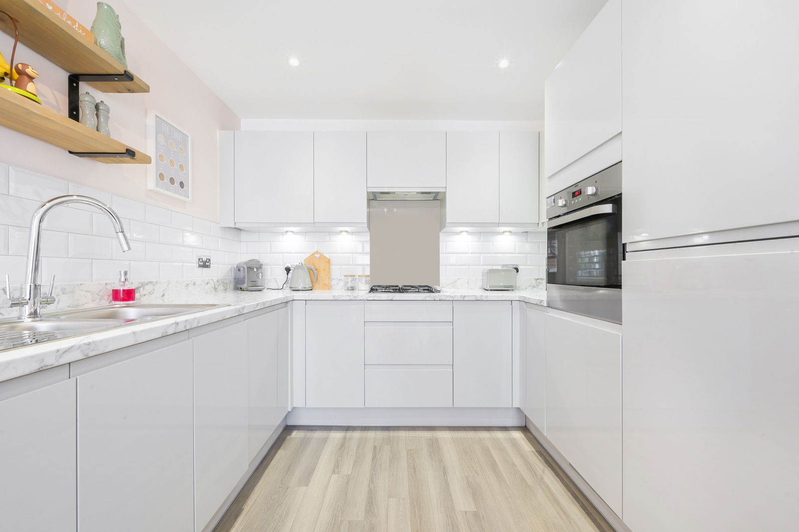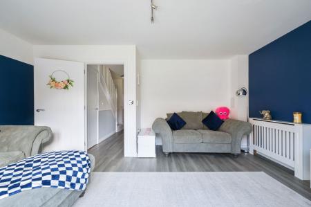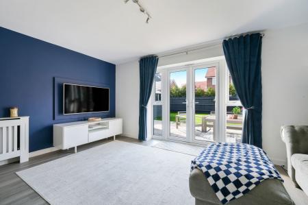 Inside, the home is finished to a high standard throughout. The bright entrance hall leads to a spacious kitchen/diner with high-gloss cabinetry, integrated appliances, and a bay window ideal for a large dining table. To the rear, the elegant living room opens directly onto the garden through French doors, creating a seamless indoor-outdoor flow. A downstairs WC completes the ground floor.