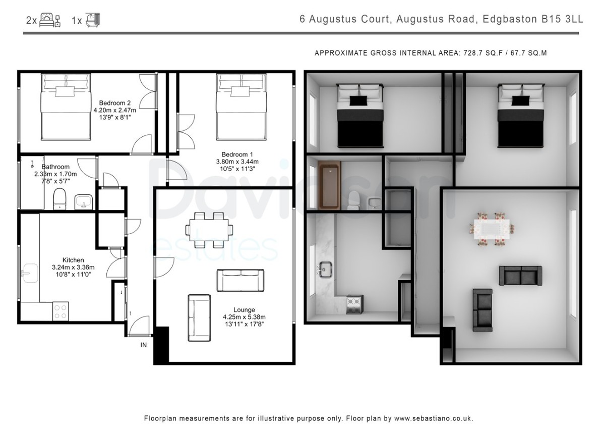 The property comprises a central hallway with useful storage, two generous double bedrooms, a spacious living room with defined dining area, a modern fitted kitchen complete with integrated appliances, and a contemporary bathroom featuring an over-bath shower.