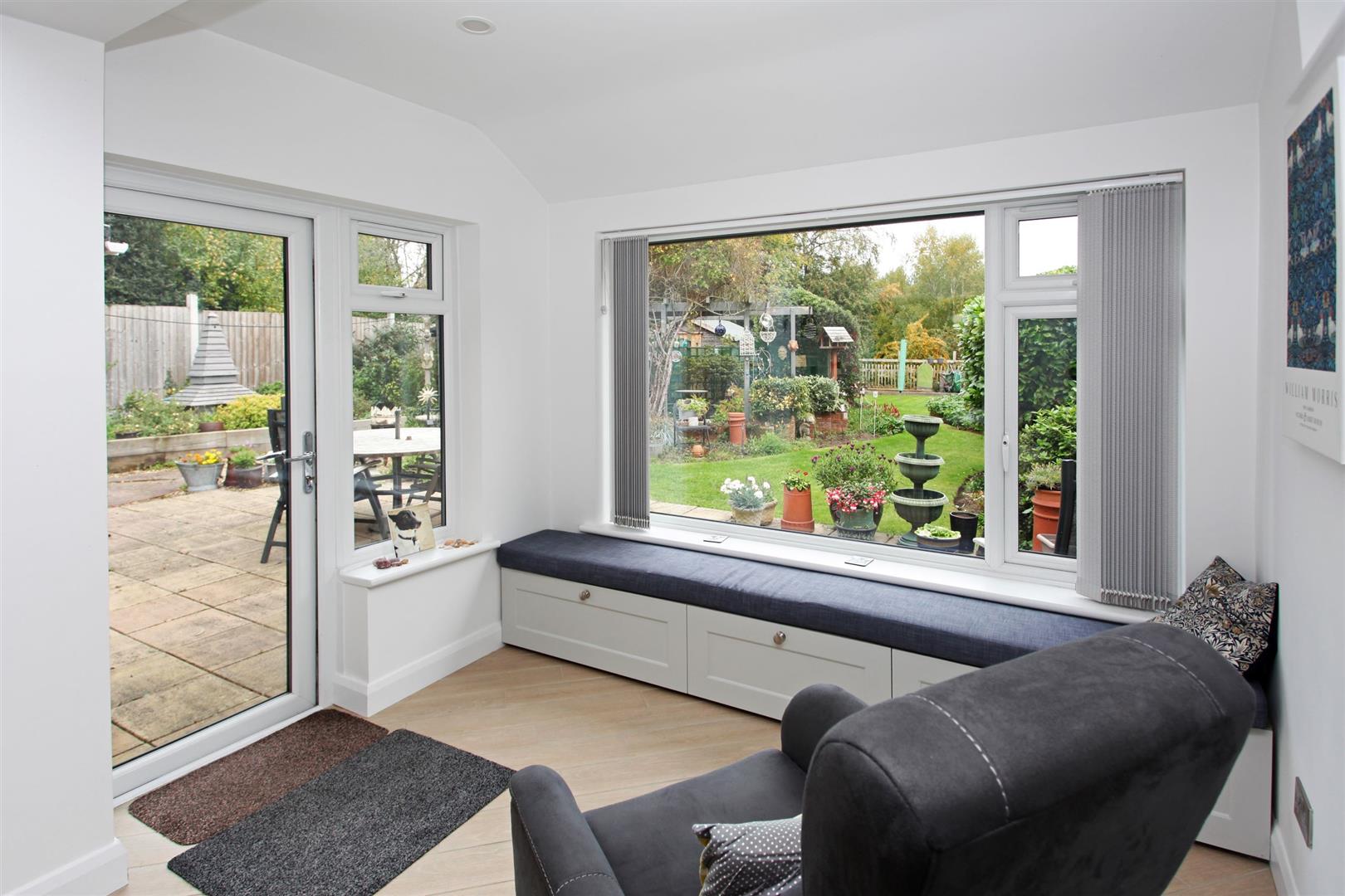 Modern 'L' Shaped Kitchen / Family Dining Area - 6.23 x 3.35 (20'5" x 10'11") - Having a range of modern shaker style cabinets comprising base and wall mounted cupboards and drawers with quartz effect composite work surfaces. Inset Belfast sink and drainer. Built-in SMEG eye level double oven and grill with integrated microwave oven. Integrated larder fridge and dishwasher. An attractive hardwearing tiled floor covering continues to the Family Dining Area separated from the Lounge by glazed bi-fold doors. Large double glazed picture window having rear aspect with views of the garden with and built-in box seating. Contemporary wall radiator.