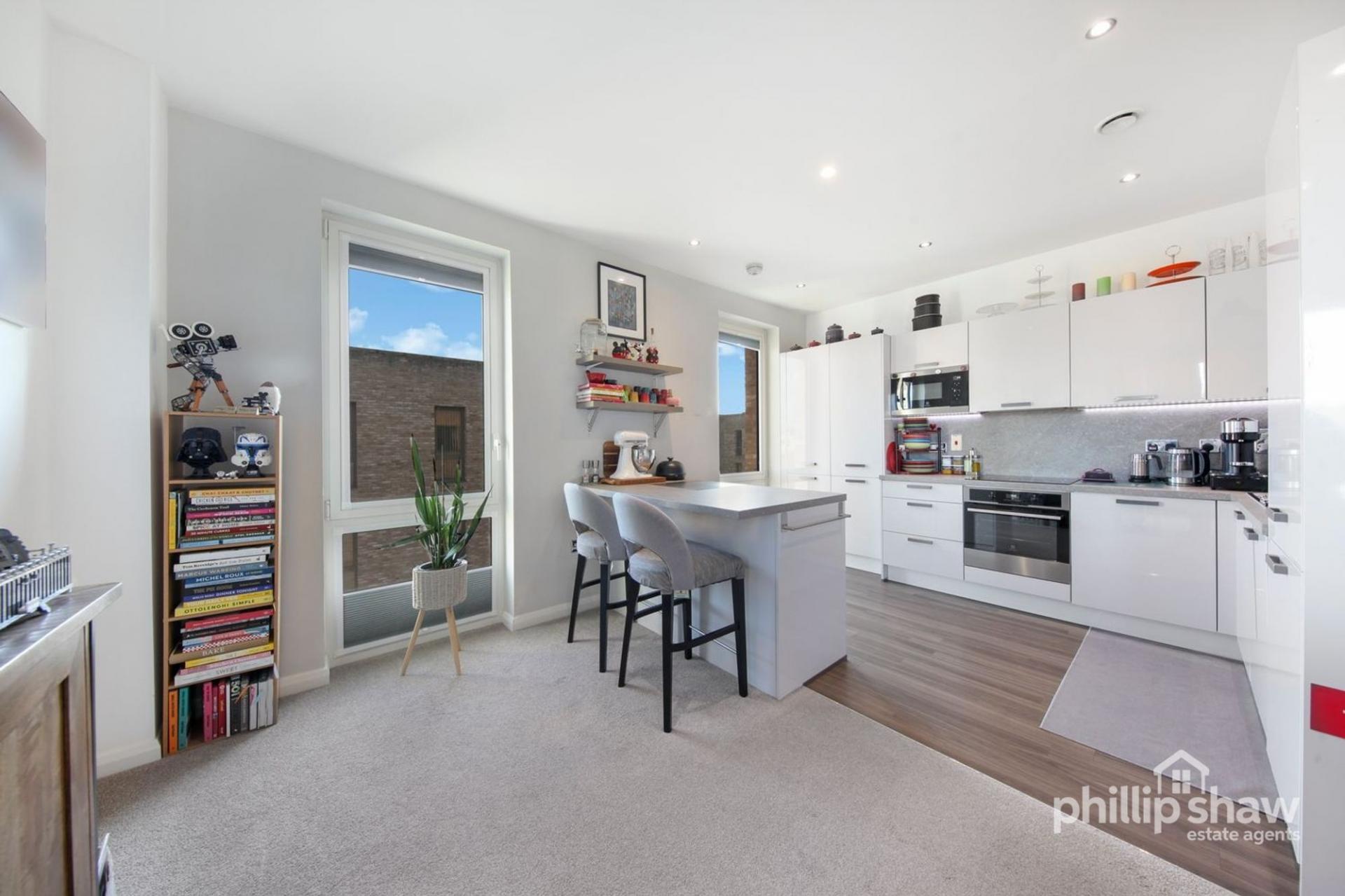 The property features floor-to-ceiling windows, allowing natural light to flood throughout, creating a bright and airy atmosphere. The generous open-plan lounge and dining area provides access to a private balcony, while the modern fitted kitchen includes a breakfast bar and comes complete with integrated appliances including AEG induction hob, AEG dishwasher, and Samsung fridge freezer, perfectly combining style and functionality.