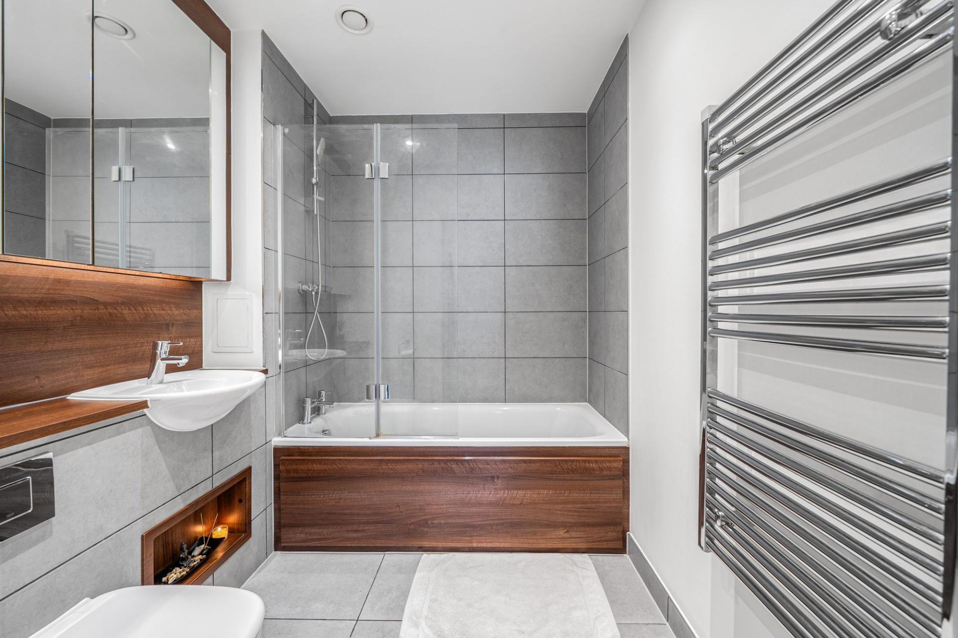 The recessed kitchen has been thoughtfully designed, providing sleek cabinetry, generous worktop space, and a full range of integrated appliances. The well-proportioned bedroom benefits from fitted wardrobes, while the contemporary bathroom boasts chic tiling, a bathtub with overhead shower, vanity unit with mirrored storage, and a heated towel rail.