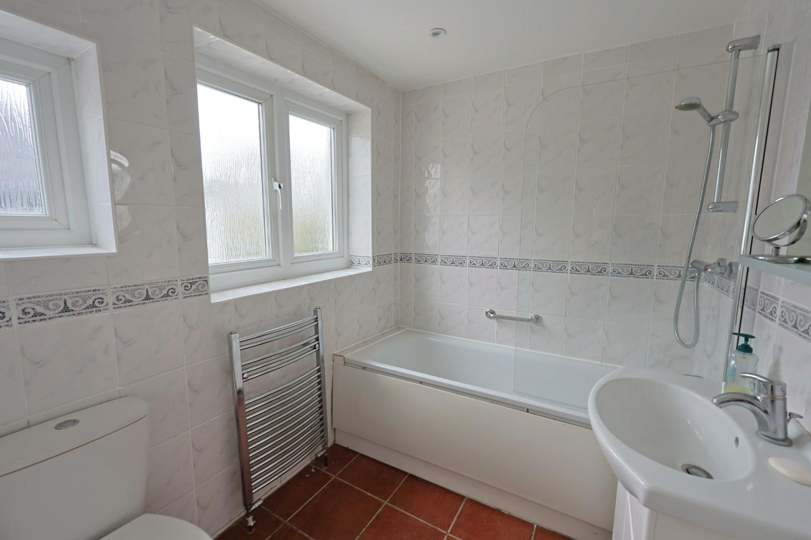 Bathroom - Panelled bath with mixer tap, shower attachment and shower screen, pedestal wash hand basin, low level WC & heated towel rail.