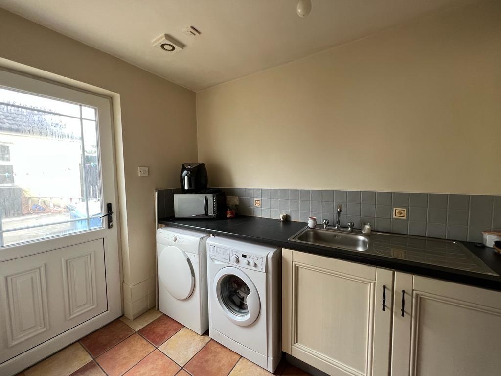 Having single drainer stainless steel sink unit, plumbed for washing machine, tiled floor.