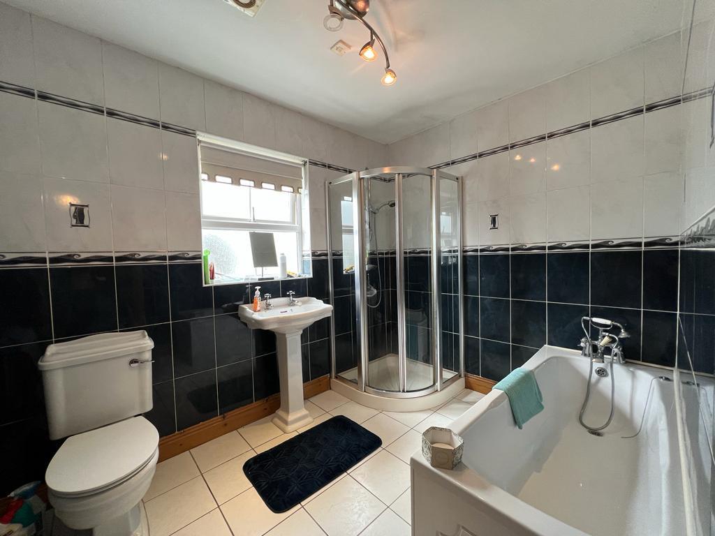 Comprising bath with hand shower attachment to taps, walk in shower, whb and wc, fully tiled walls and floor.