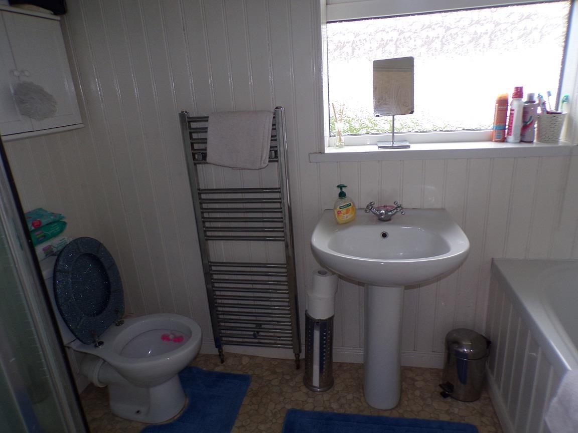 Comprising bath with shower attachment to taps, whb and wc, fully tiled walk in electric shower, heated towel rail, panelled walls.