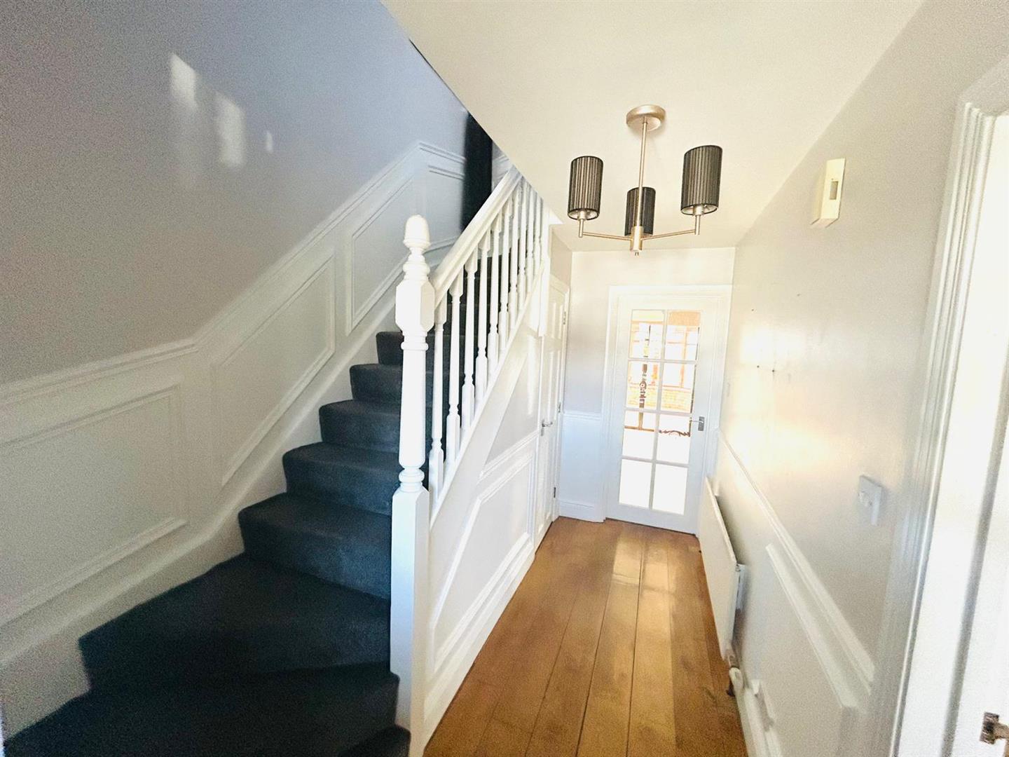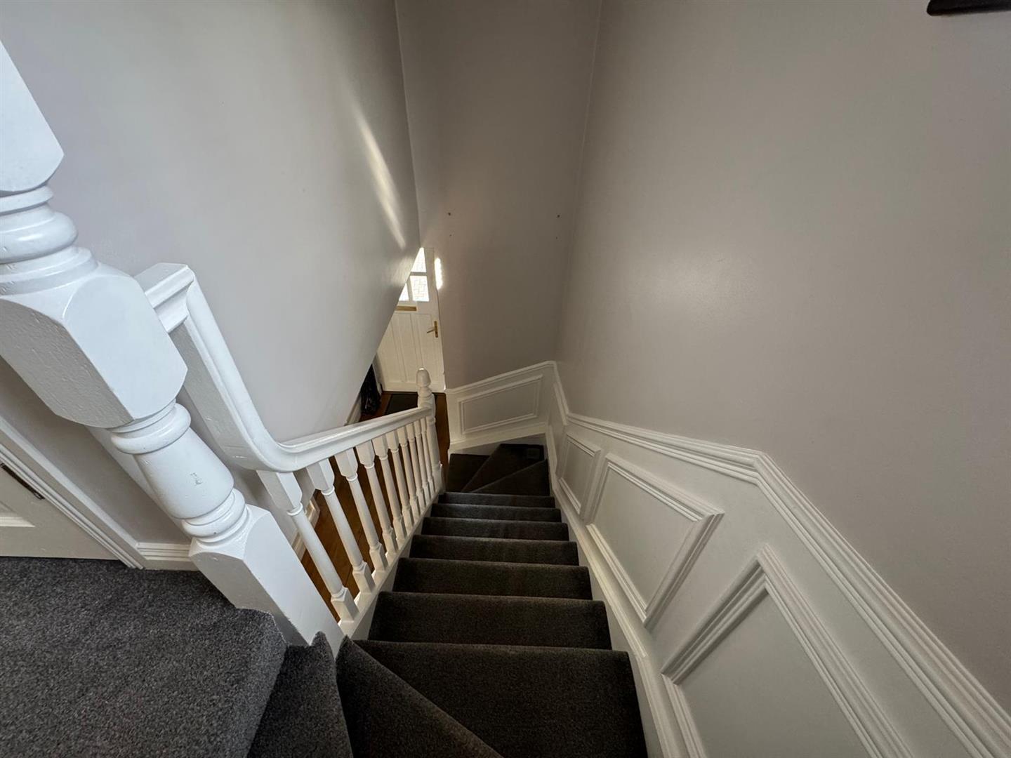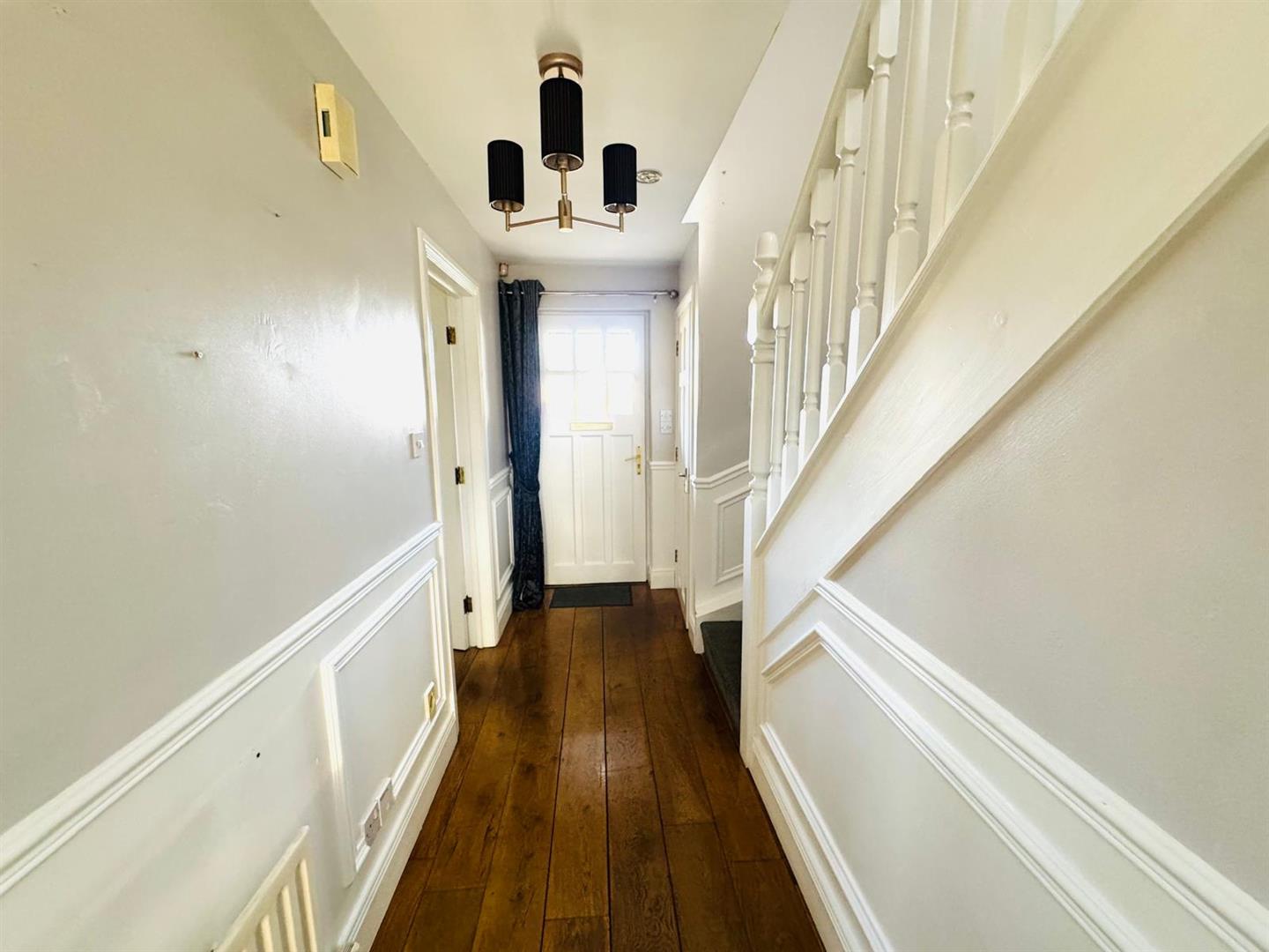 Having understairs storage, 1/2 height wooden panelled walls, wooden floor.