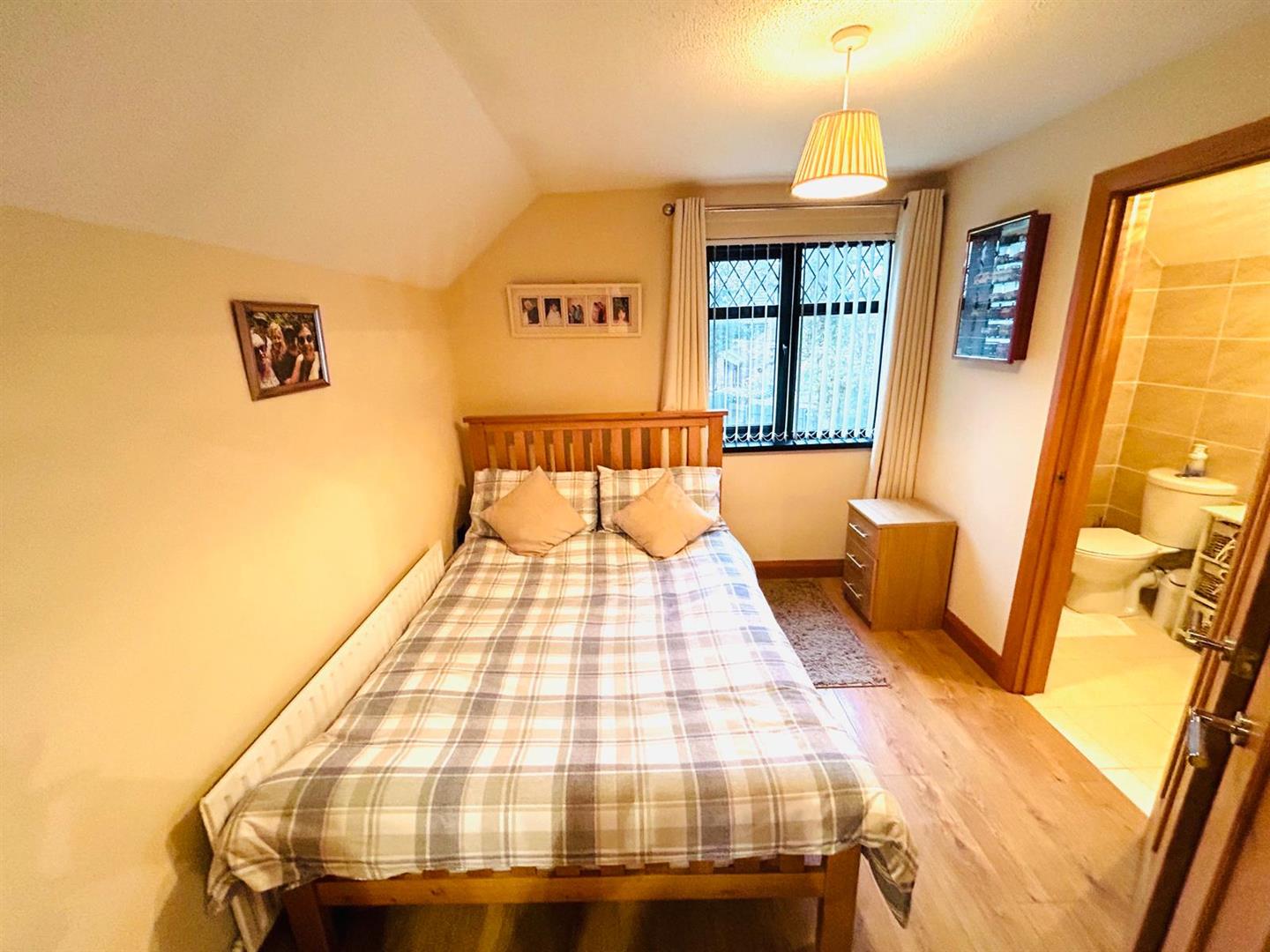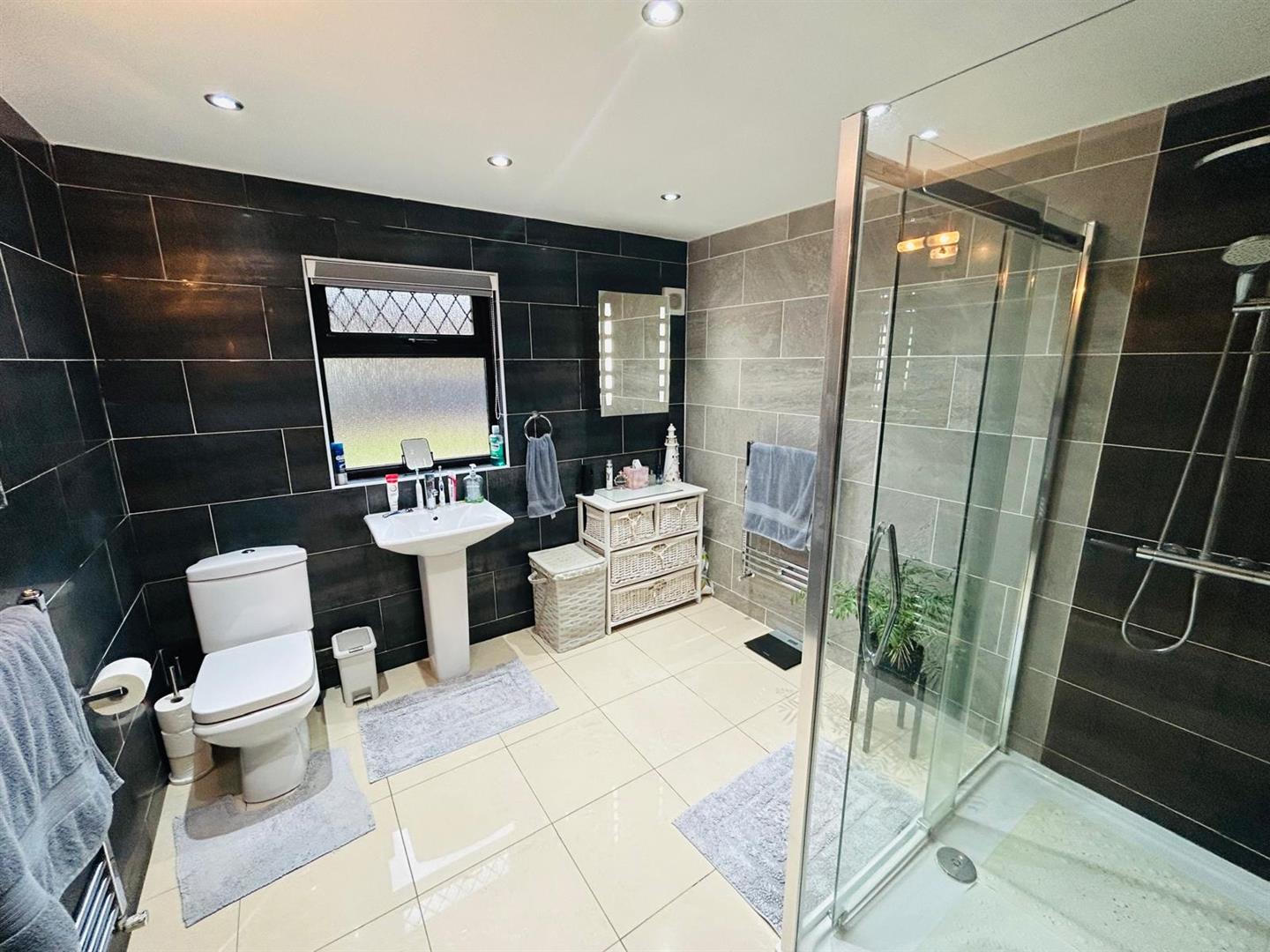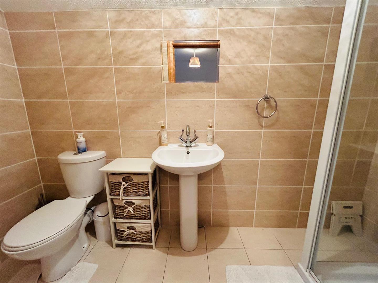 Comprising fully tiled walk in shower, whb and wc, mirrored cabinet with light, recessed lighting, heated chrome towel rail, fully tiled walls, tiled floor.