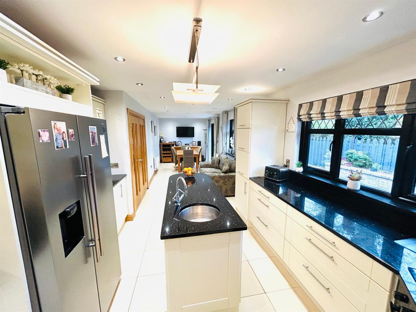 10.01m x 2.64m (32'10" x 8'8") - Having excellent range of eye and low level units with concealed lighting under, glazed display cupboards, stainless steel sink set in granite worktop, integrated hob and underoven set in corner with extractor hood and tiling around, space for American style fridge / freezer, centre island with storage, plumbed for dishwasher, granite worktop, ample dining space with French doors to rear, tiled floor.