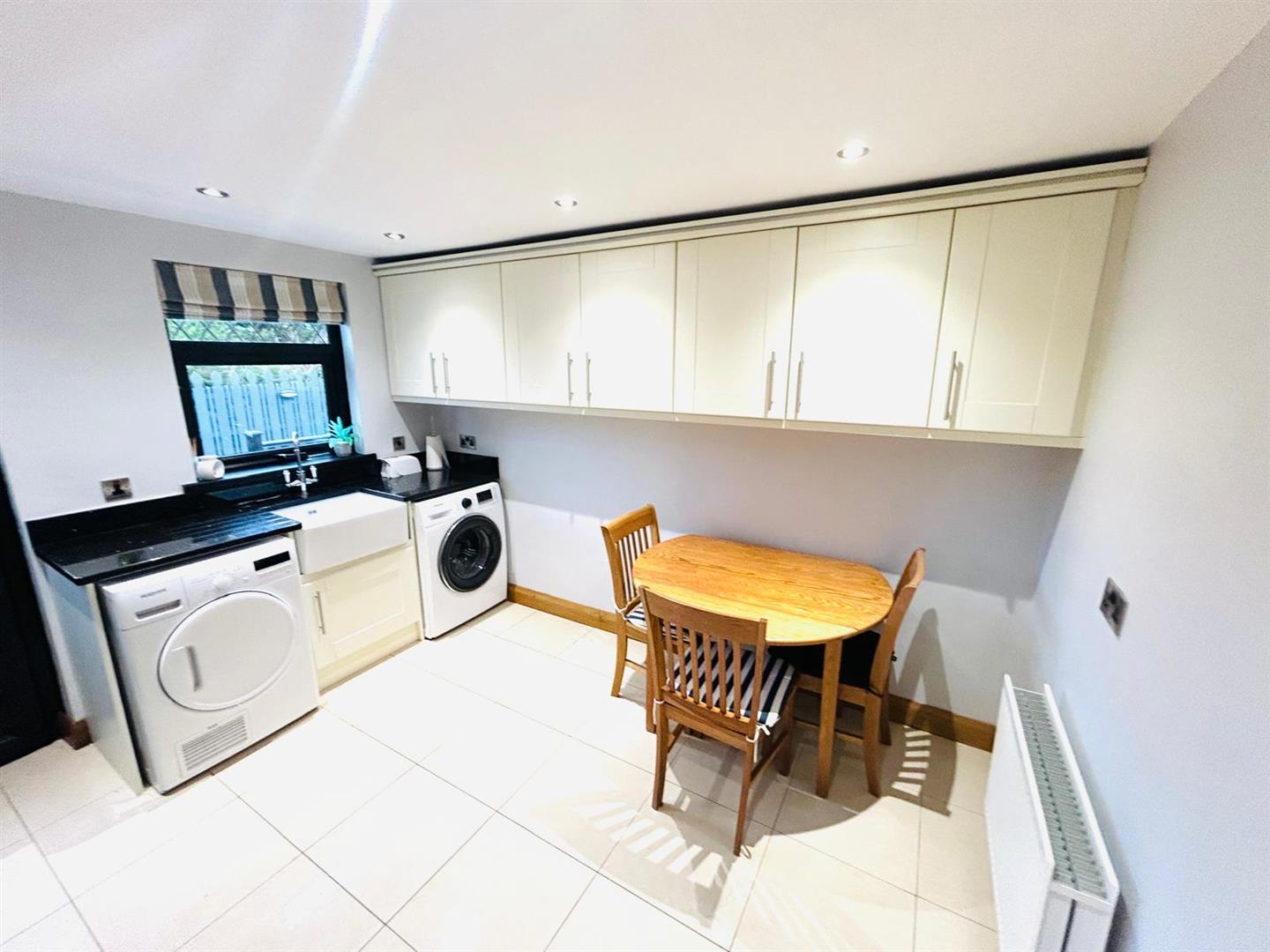3.45m x 2.84m (11'4" x 9'4") - Having eye and low level units, Belfast sink unit with mixer taps set in granite worktop, plumbed for washing machine, space for tumble dryer, recessed lighting, tiled floor.