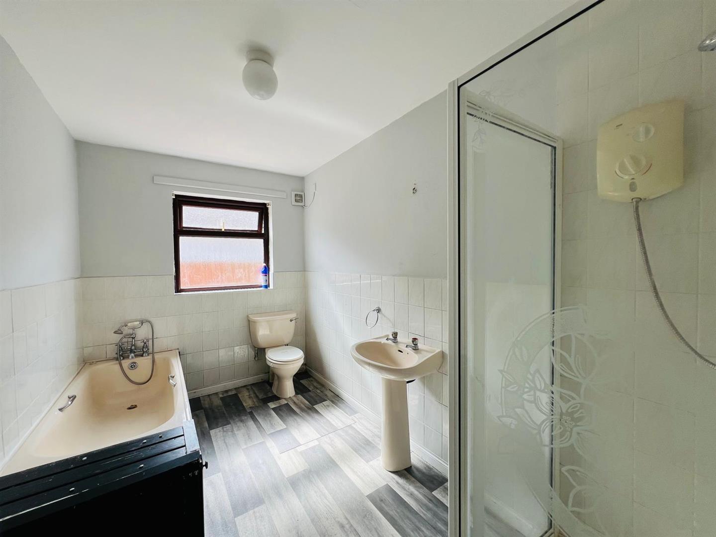 Comprising bath, whb and wc, walk in electric shower, 1/2 tiled walls.