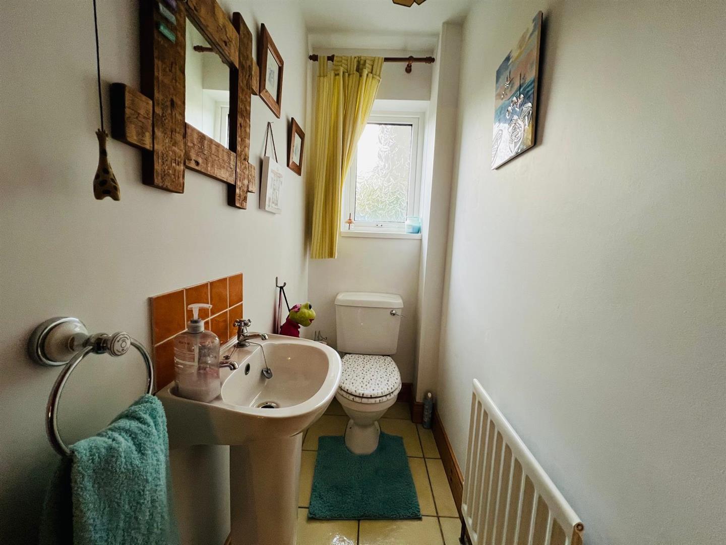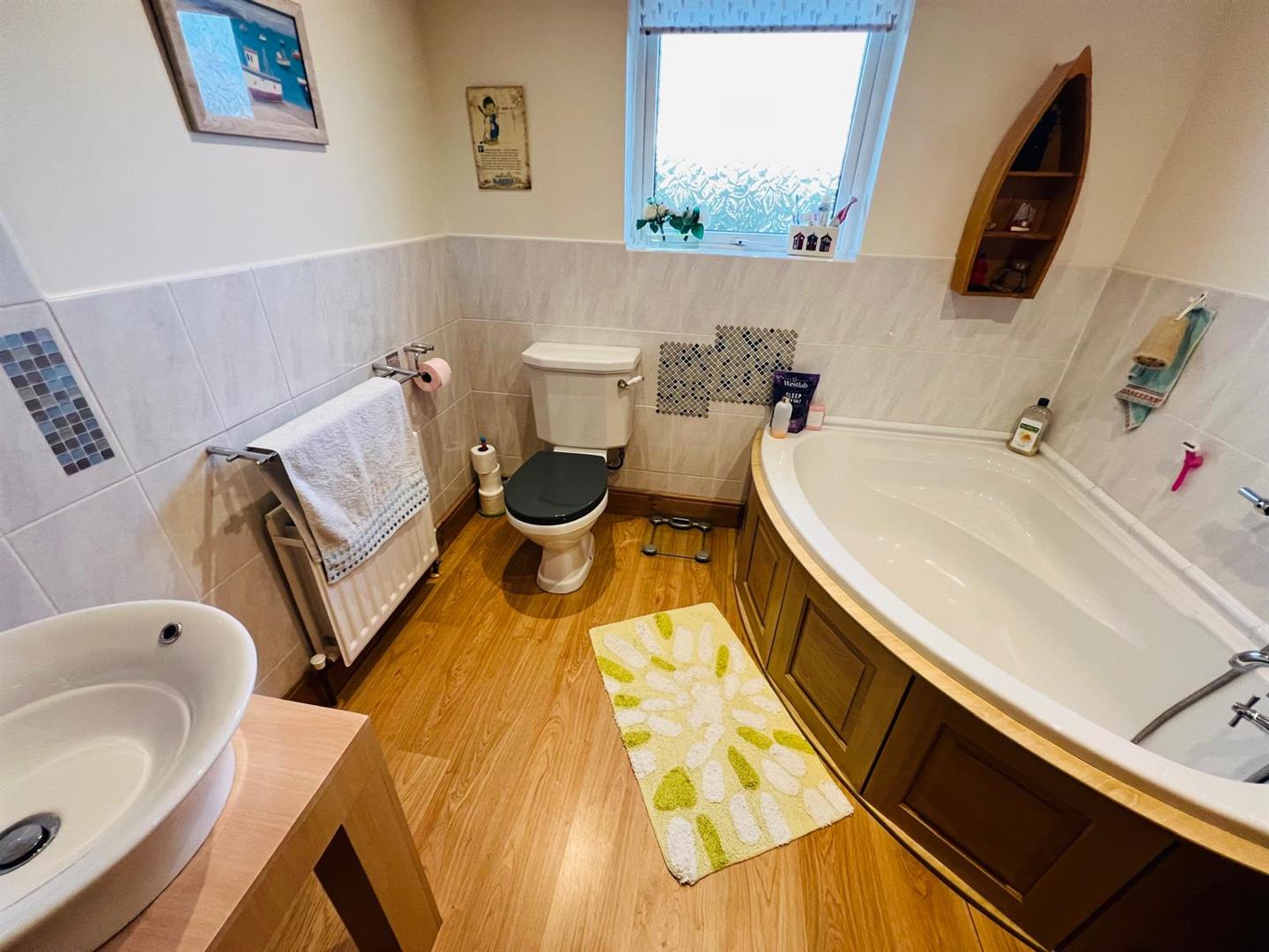 Comprising corner bath with shower fitting to taps, whb and wc, 1/2 tiled walls, laminated wooden floor.