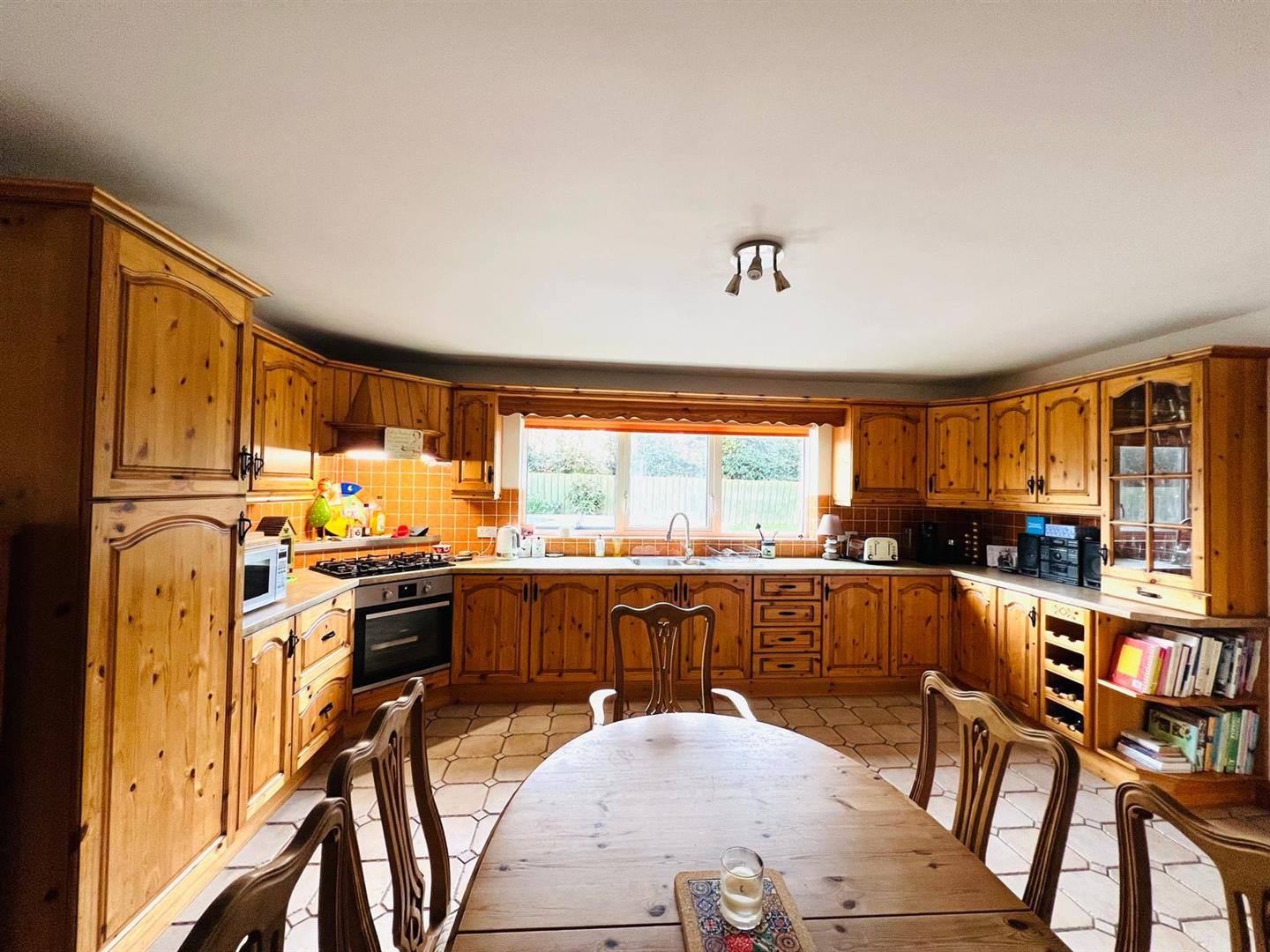 5.03m x 4.88m (16'6" x 16') - Having range of eye and low level units with concealed lighting under, tiling between units, matching pelmet over window, wine rack, glazed display cupboards, 1 1/2 bowl stainless steel sink unit with mixer taps, 5 ring gas hob, electric underoven, ample dining space, tiled floor.