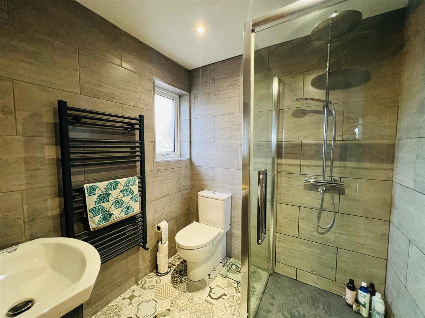Comprising fully tiled walk in power shower, whb set in vanity unit, wc, grey radiator, recessed lighting.