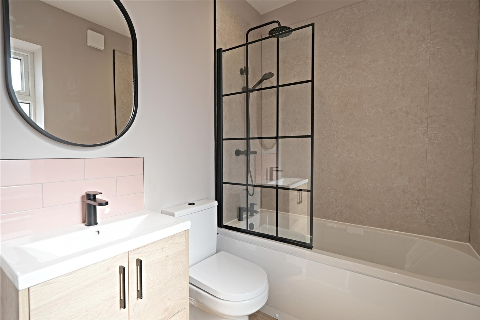 Bathroom - Bath with mixer taps. Shower. Wash hand basin. Extractor fan. W.C. Towel radiator. UPVC double glazed window to rear elevation.