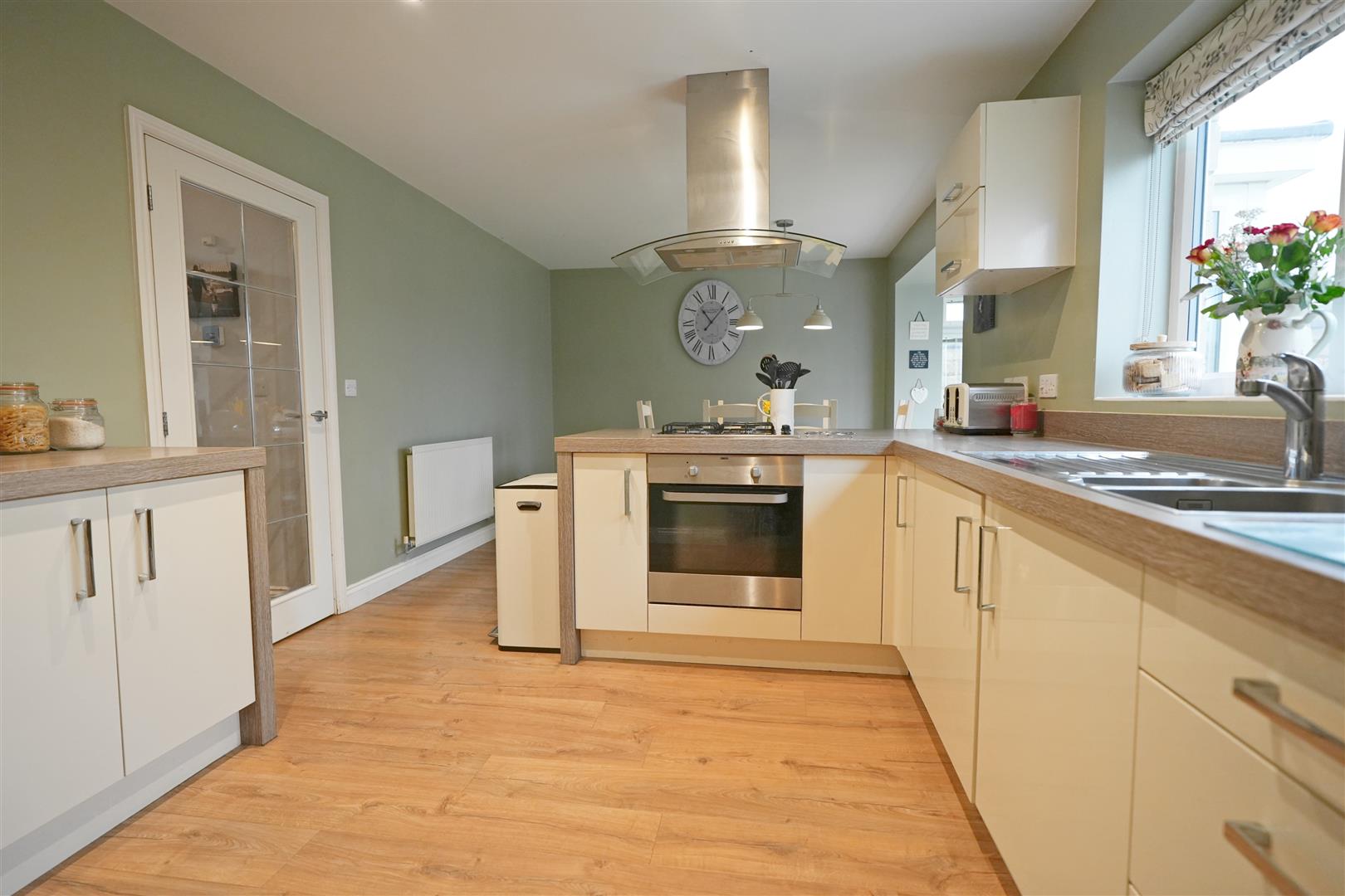 Dining Kitchen - 3.202 x 5.868 (10'6" x 19'3") - Fitted kitchen with wall and base units. Stainless steel one and a half bowl sink. Electric oven. Gas hob. Stainless steel and glass cooker hood. Radiator. UPVC double glazed French doors to rear elevation. UPVC double glazed window to rear elevation.